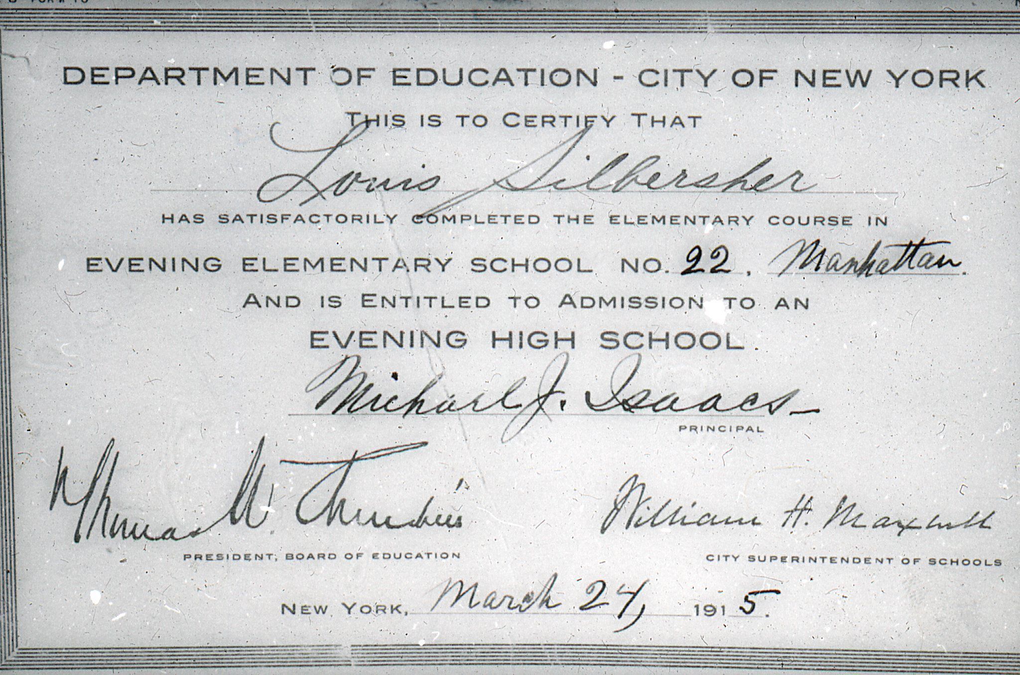Photograph of Certificate for Louis Silbersher certifying that he completed the elementary course in Evening Elementary School number 22 in Manhattan and is entitled to admission to an evening high school. Certificate is dated March 24, 1915.Acquisition