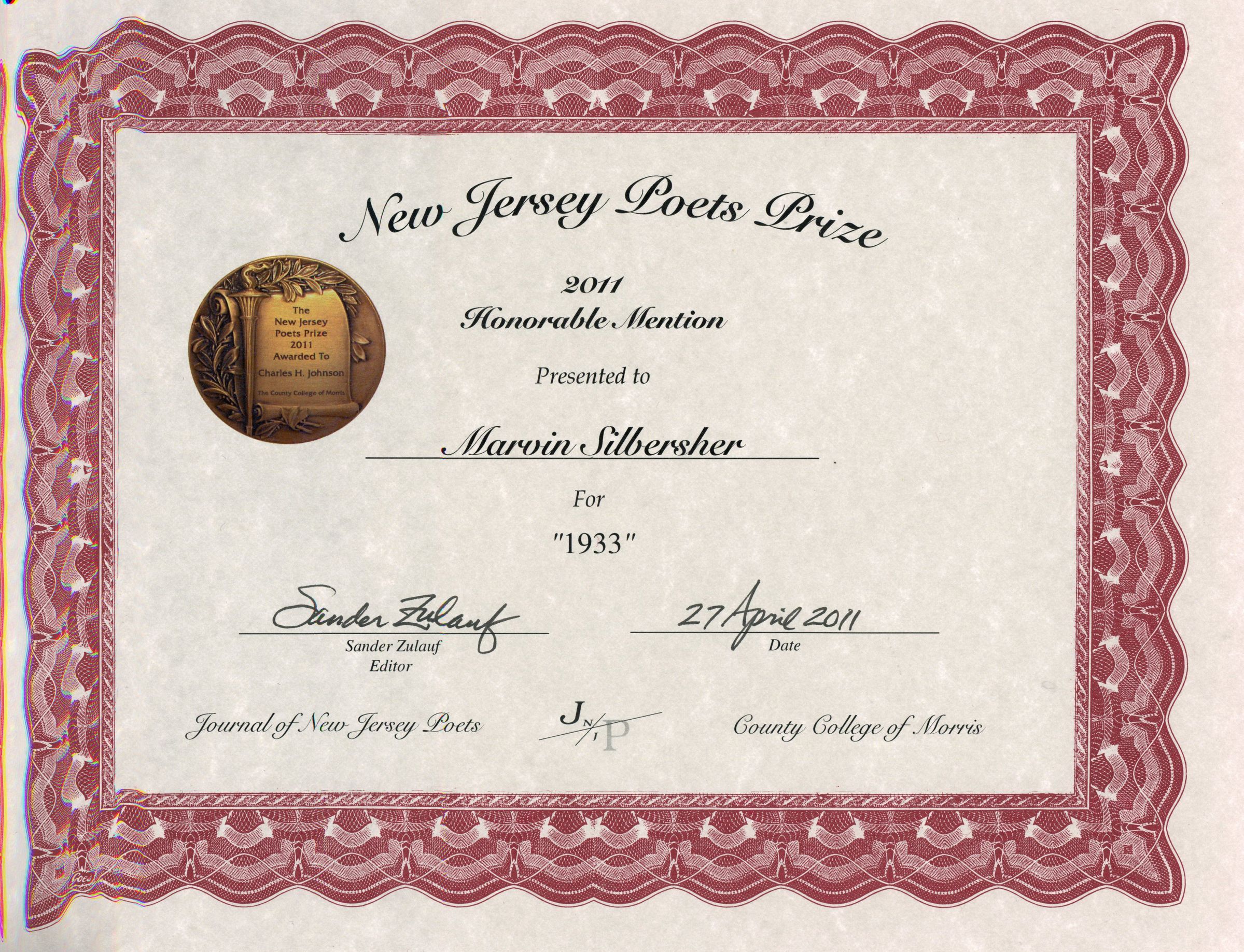 Silbersher: Marvin Silbersher New Jersey Poets Prize, 2011