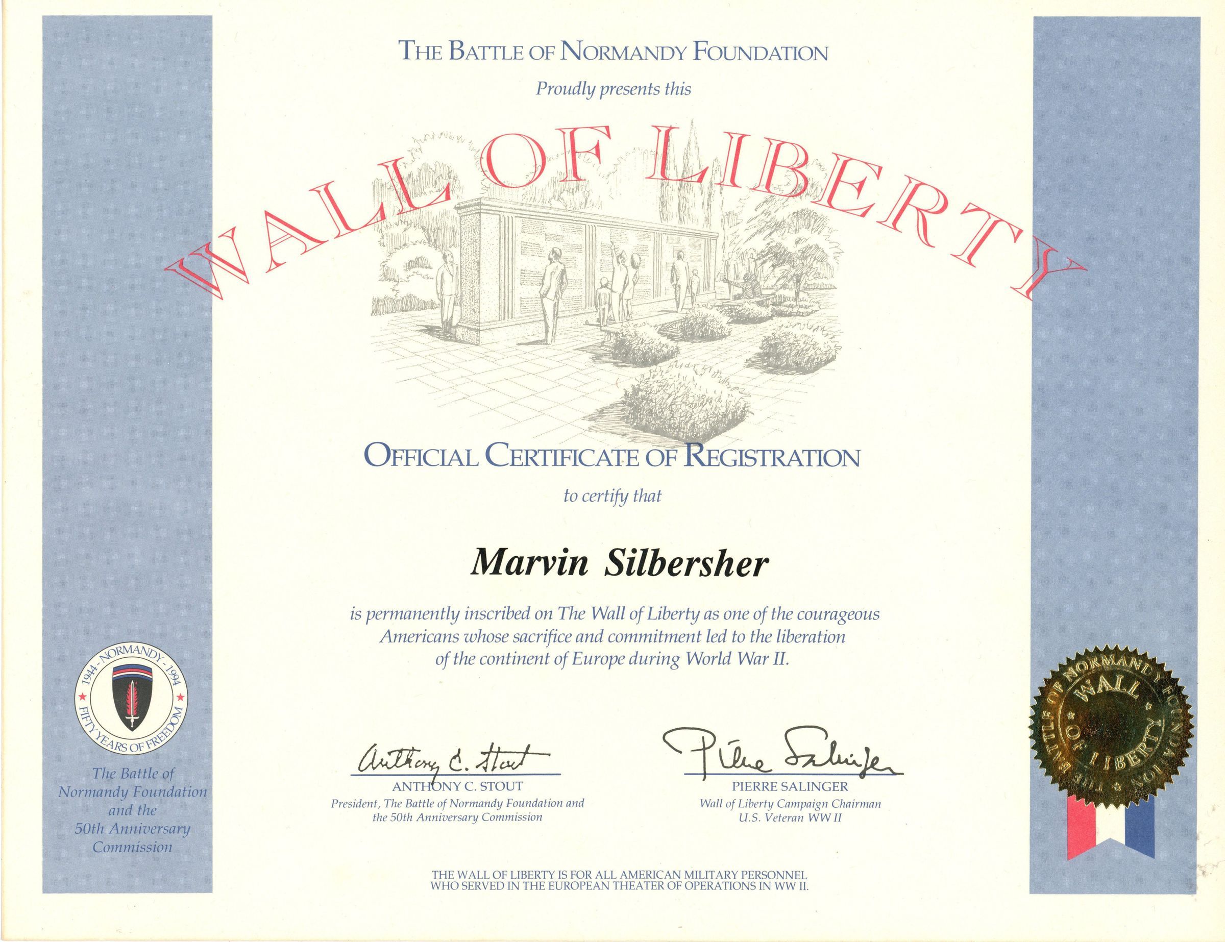 Silbersher: Marvin Silbersher Wall of Liberty Registration Certificate