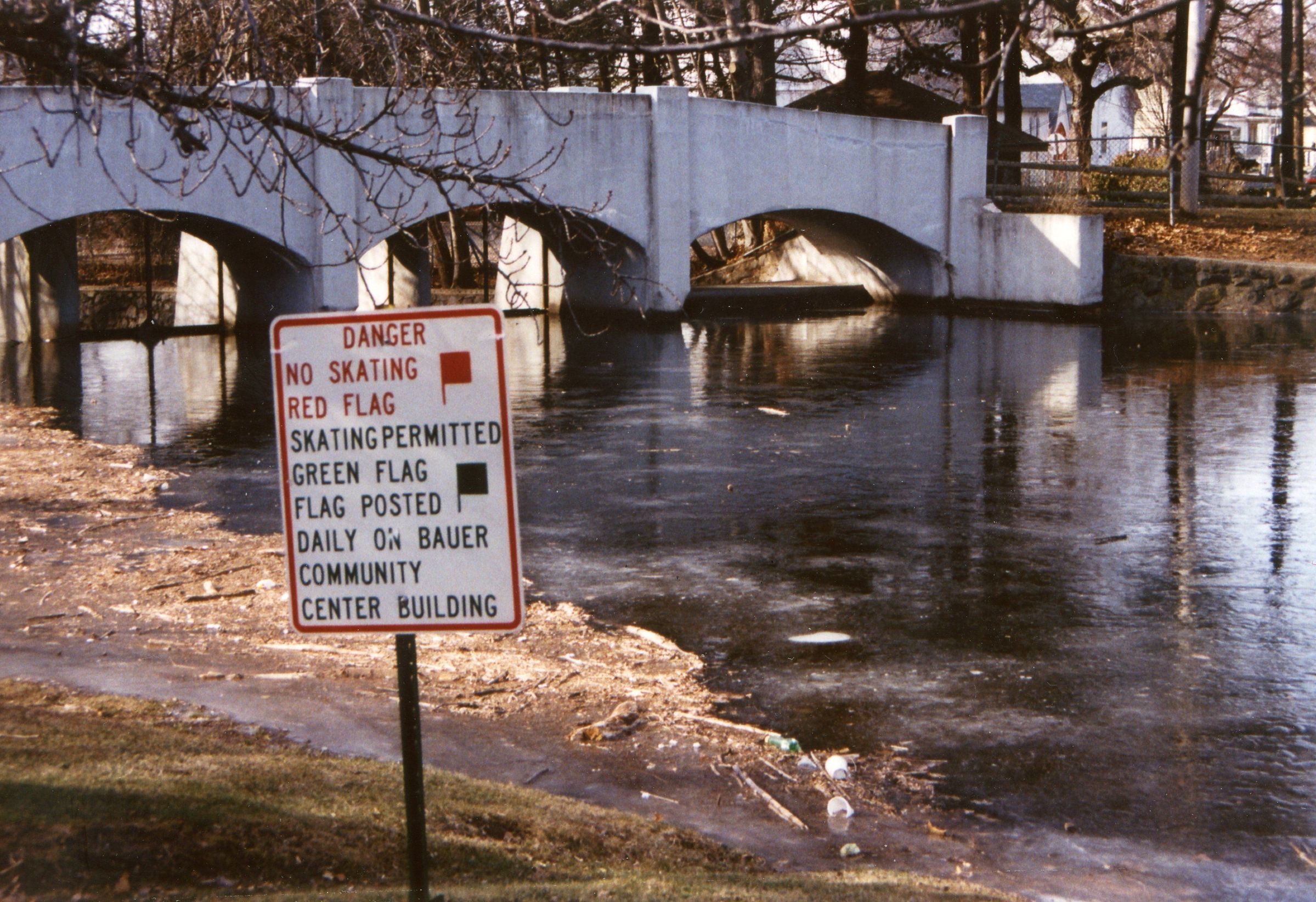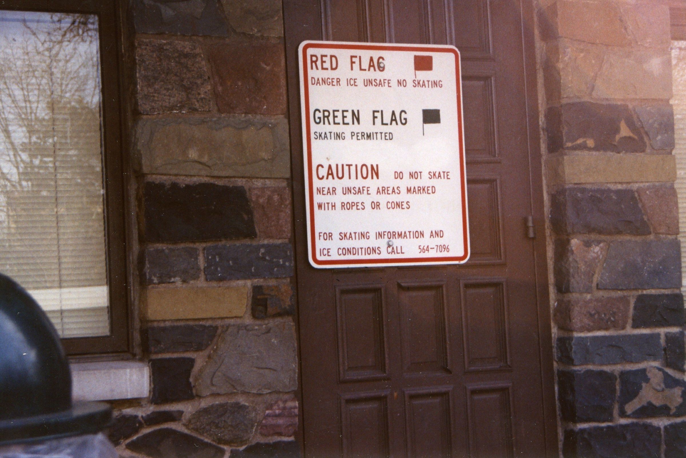 Photographs of the signs indicating when it is safe to skate on the Taylor Park Pond from January 24, 2003. Red Flag means no skating, Green Flag means safe to skate.Acquisition