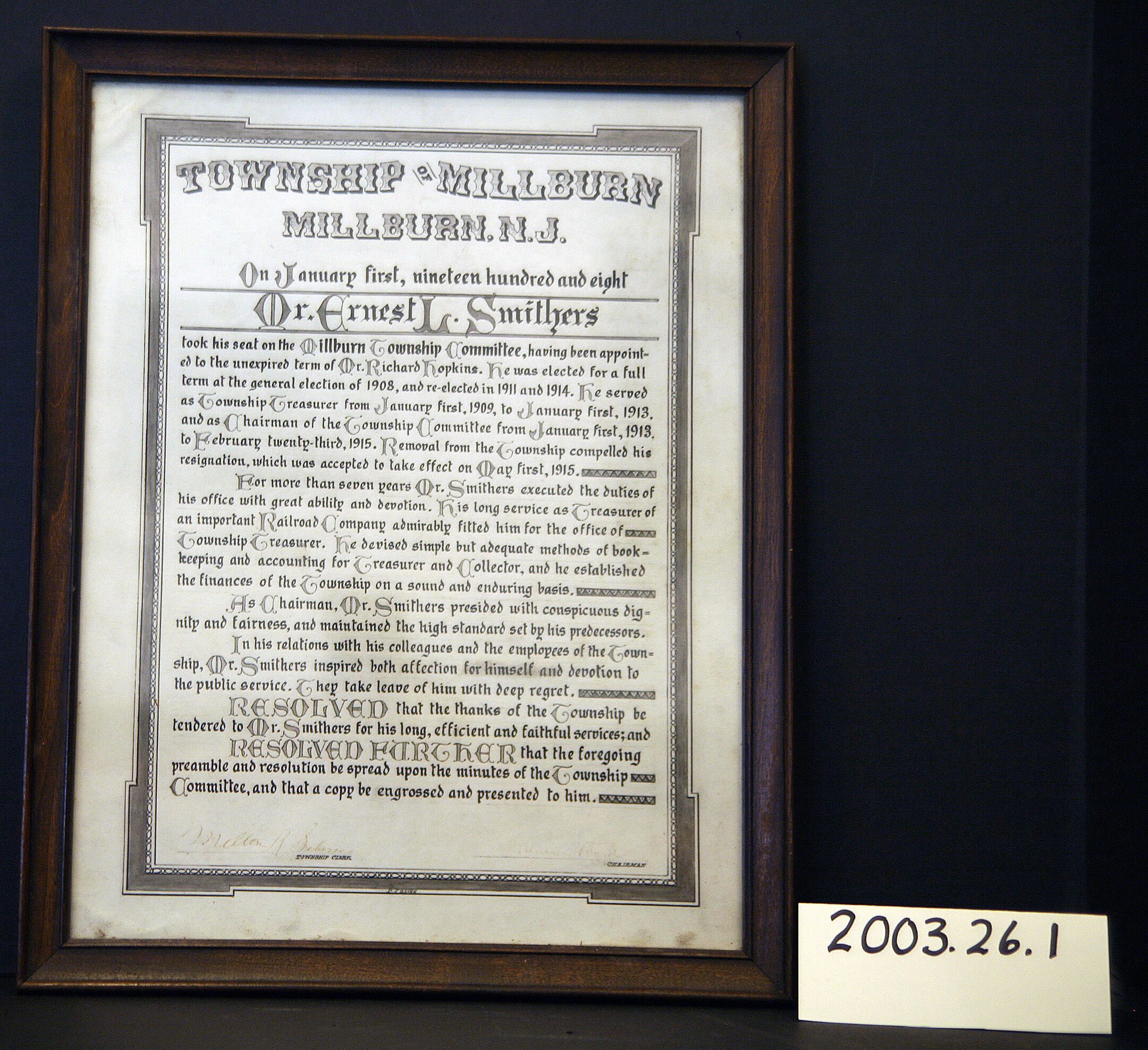 1915 Township Committee Resolution in Appreciation of Ernest Smithers