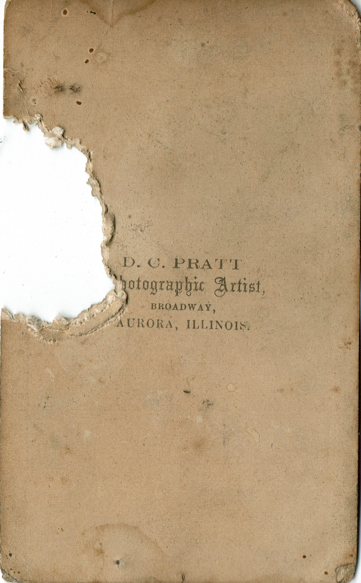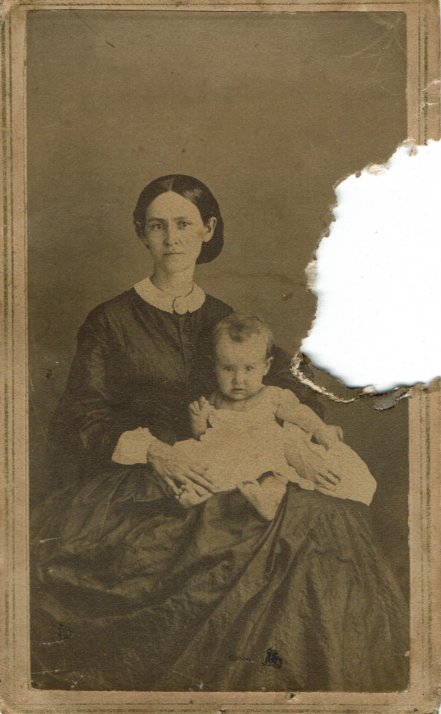 Based on identification provided by Elizabeth Rea Snow, the photograph may depict Angeline (Talmage) Snow, who was the first wife of the first Oren Theodore Snow ((1832 Massachusetts-1892, Batavia, Il.) wife . Angeline died in Batavia in 1872. The baby in her lap is most likely Bonnie's older sister Emma. Carte-de-Visite photograph. Verso of CDV reads D.C. Pratt, Photographic Artist, Broadway, Aurora, Illinois.Photograph Details