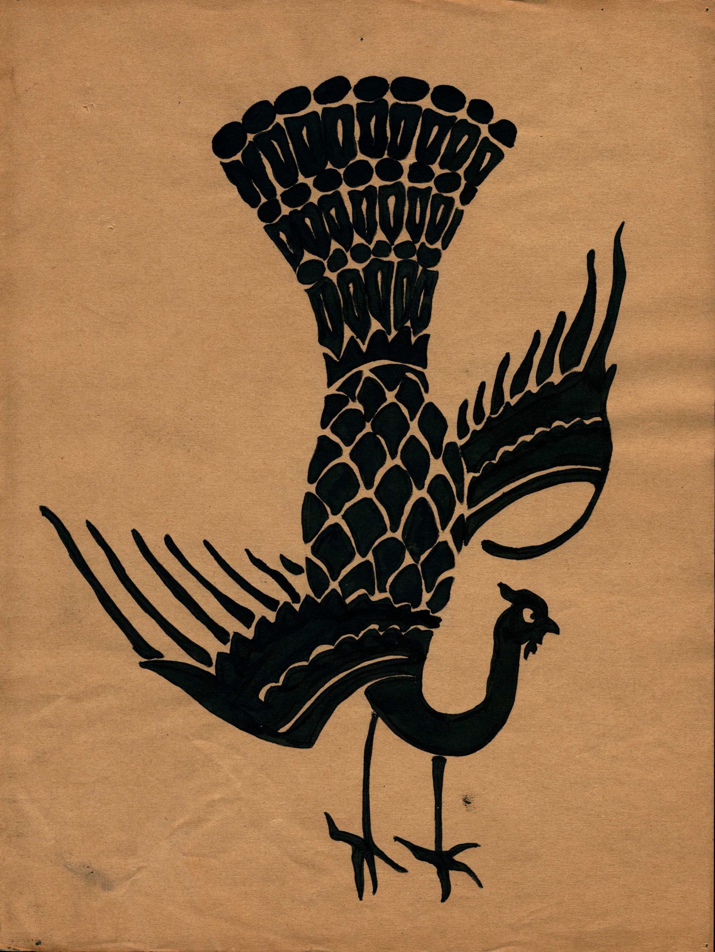 Black ink on paper sketch of a peacock by Bonnie Snow. One of five ink sketches on brown paper.Collection