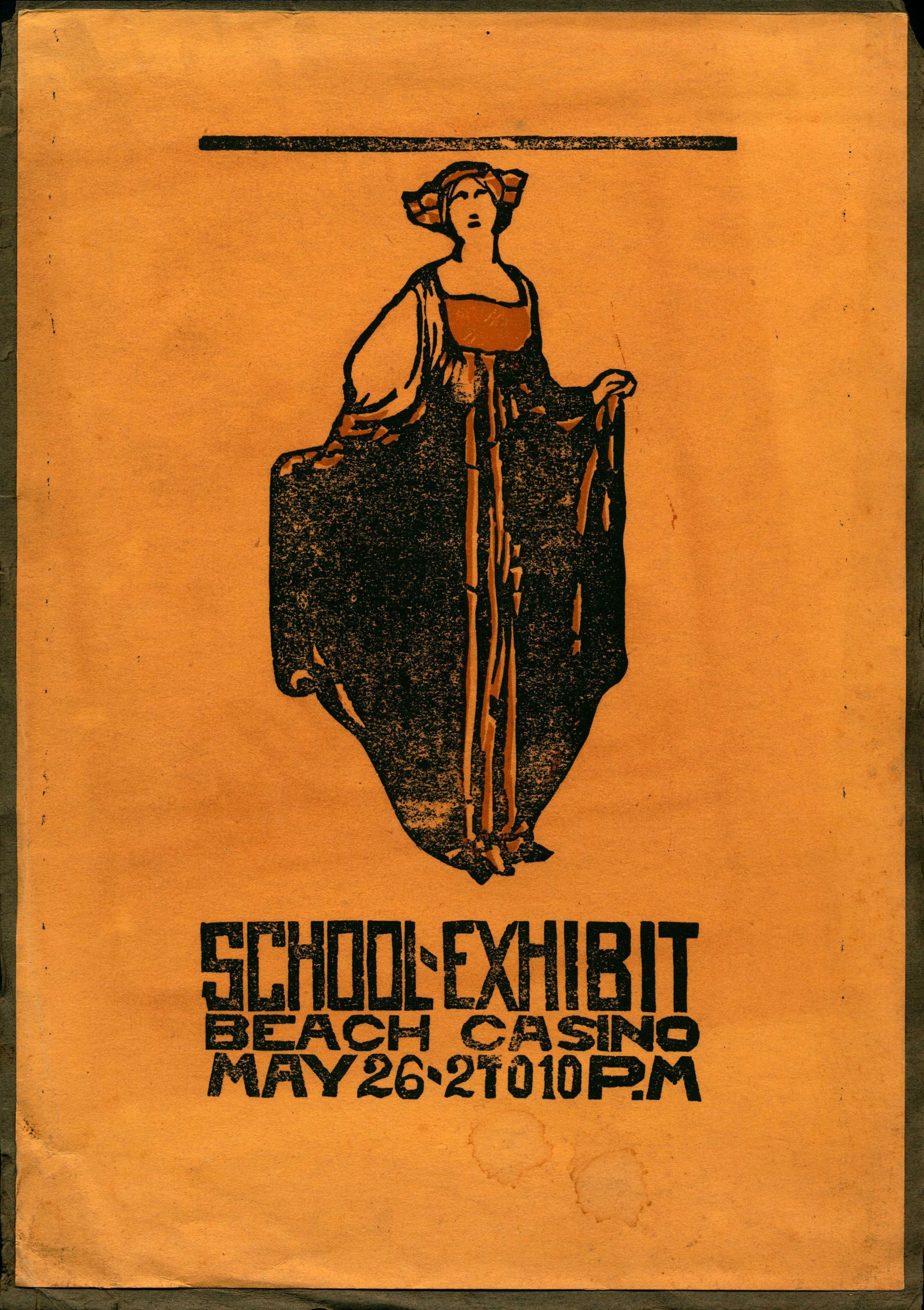 Woodblock print poster for a school art exhibit at Beach Casino, in Asbury Park on May 26, 1916 2-10 p.m. The exhibition featured work from students kindergarten-high school in the Asbury Park public school district.Collection