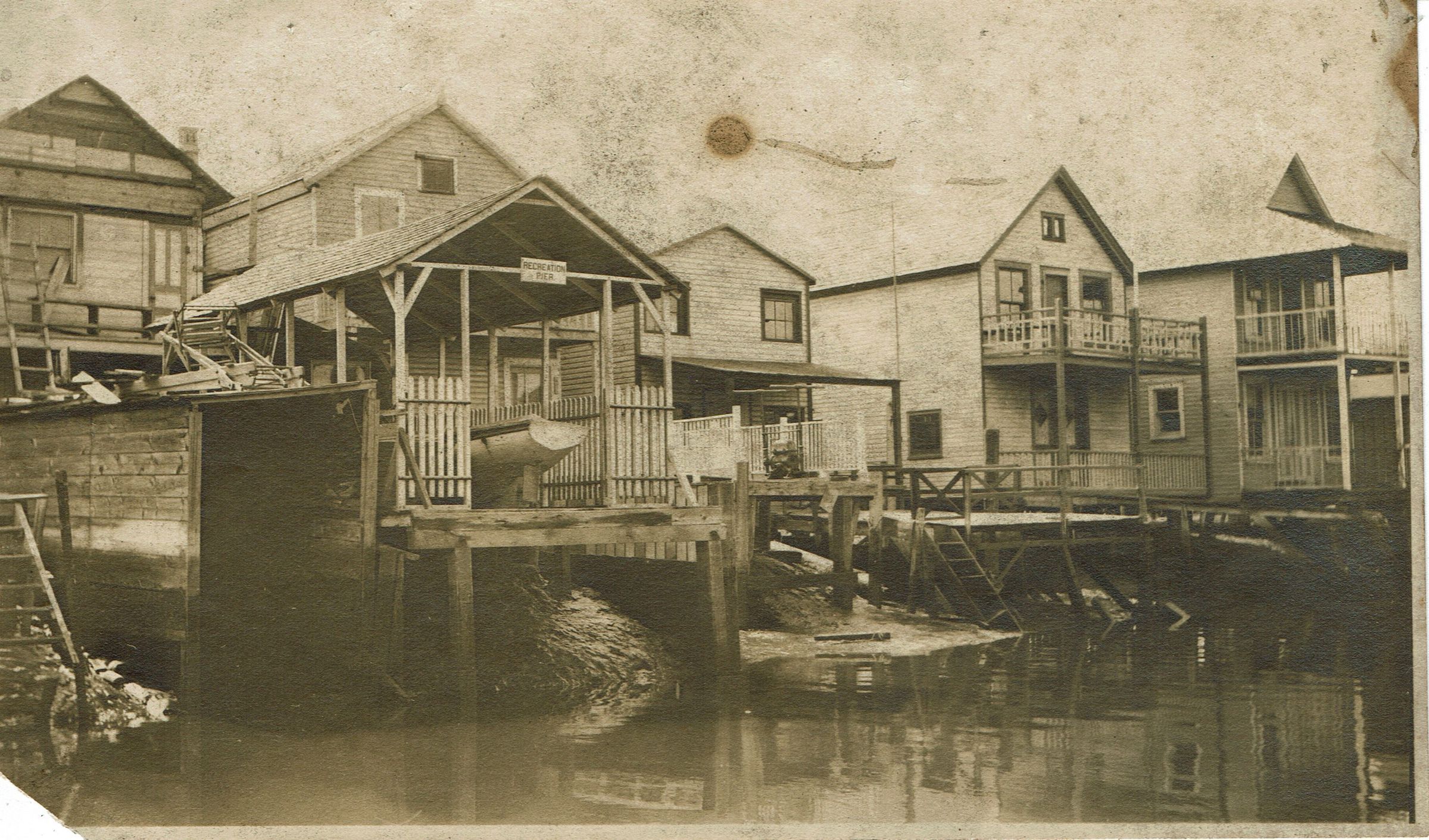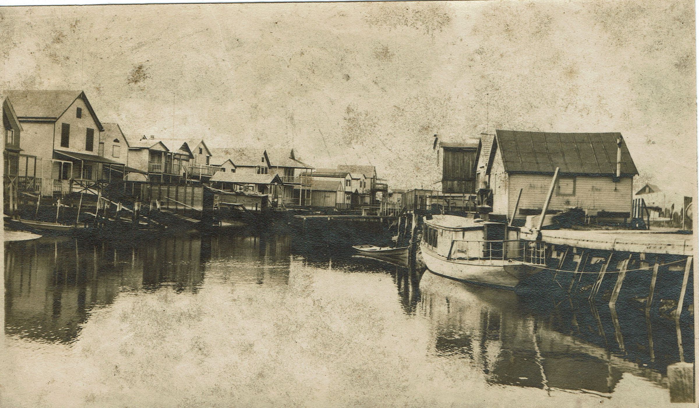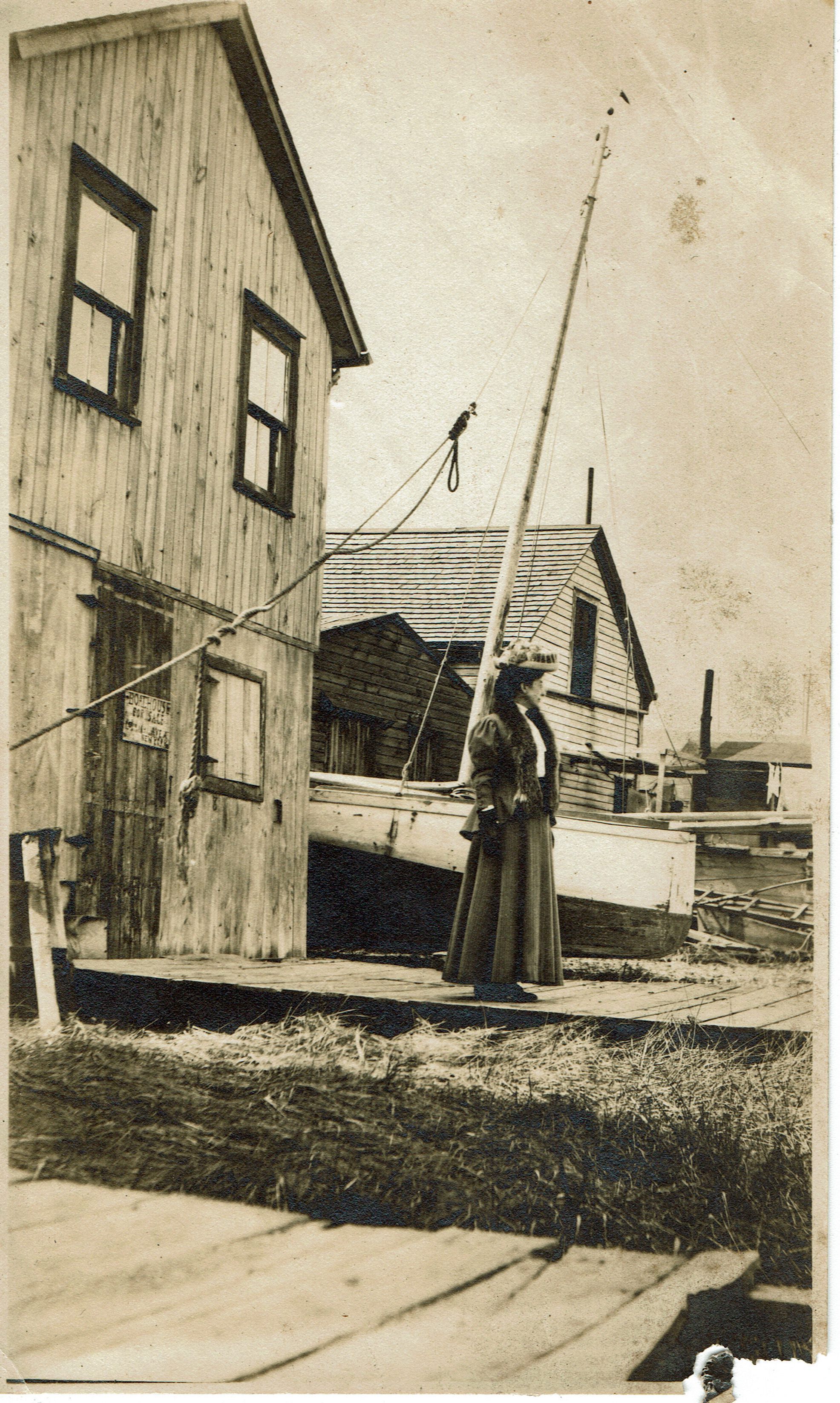 Informal photograph of Bonnie Snow standing outside of a boathouse. Two additional photographs from same location.Collection
