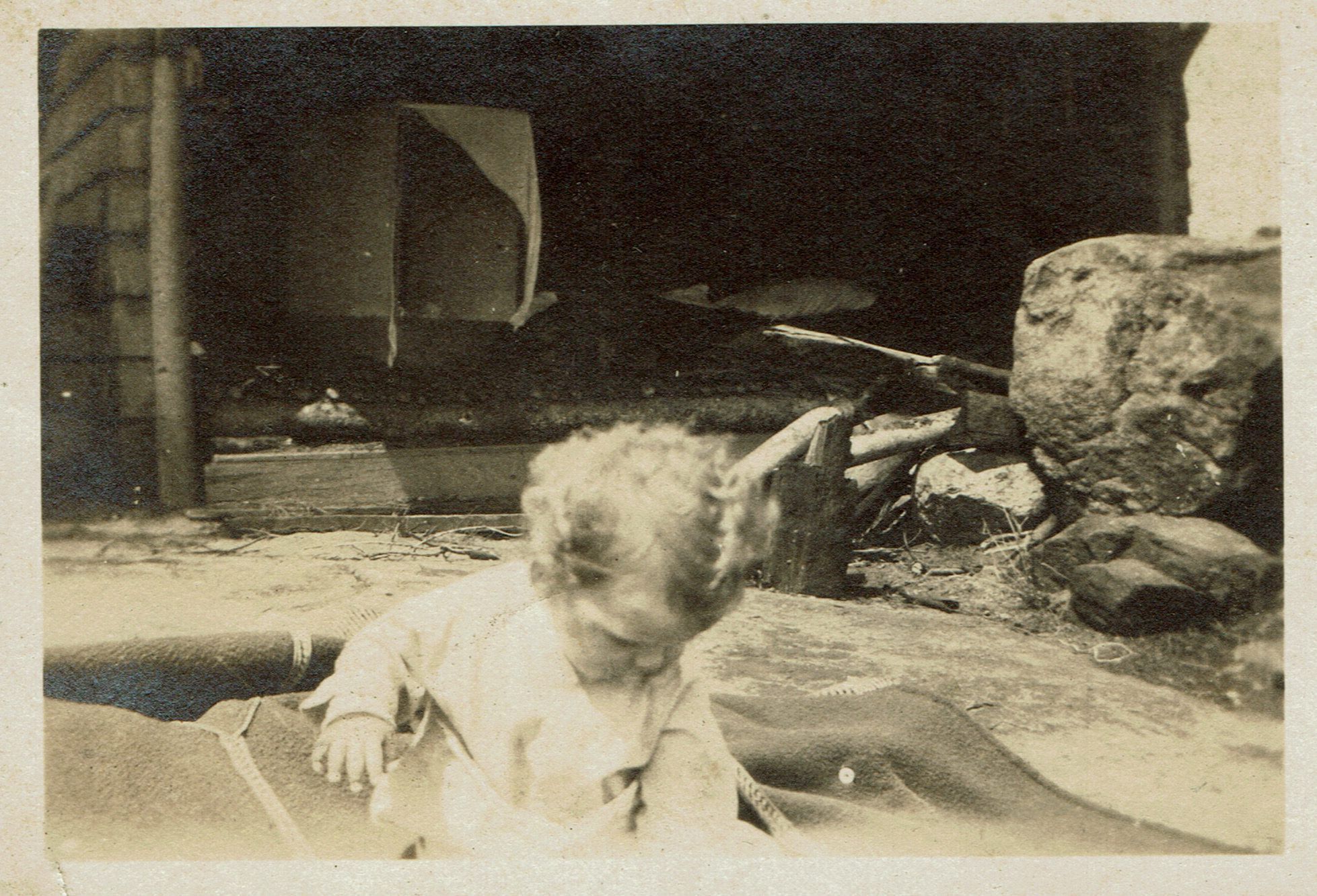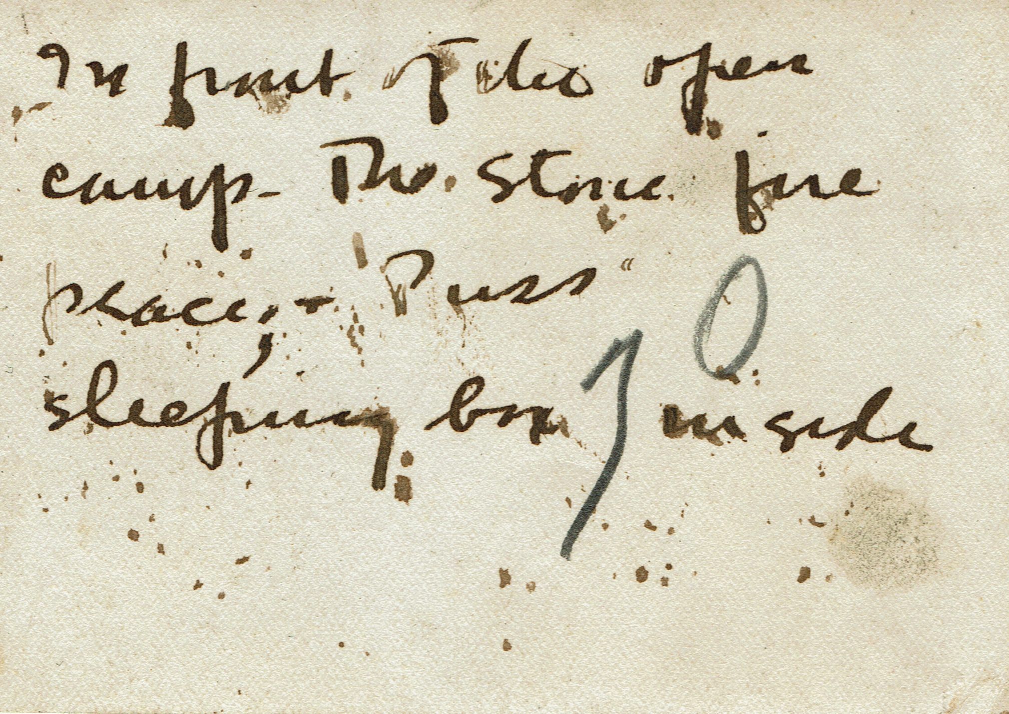 Family photograph from Bonnie Snow's collection. Verso of photo reads: "In front of the open camp. The stone fire place & "Puss" sleeping box inside.Collection