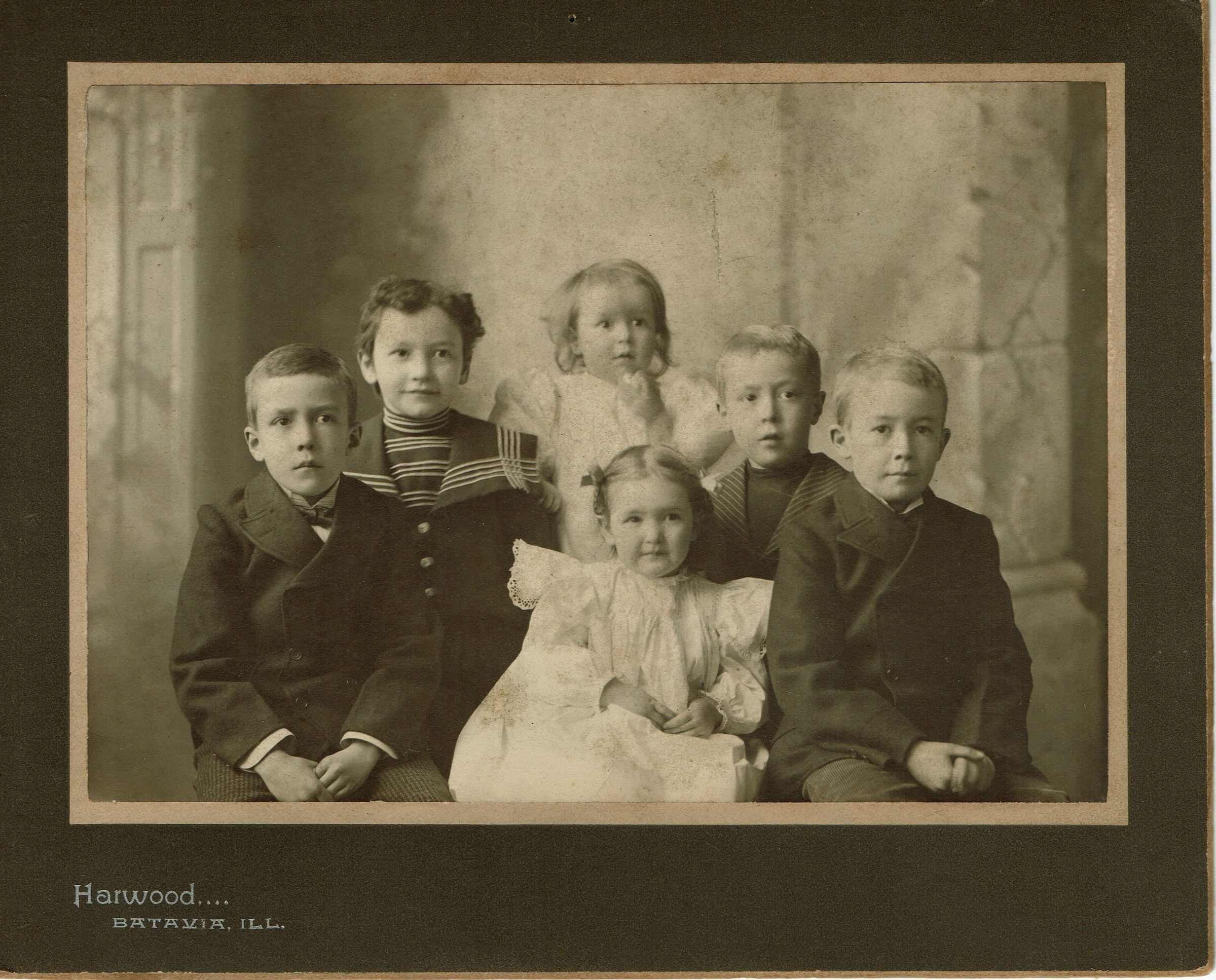 Photograph of 6 children seated and within a photographic studio. Photograph is mounted on dark gray board stamped Harwood, Batavia, Ill. Identities of children is unknown.Collection