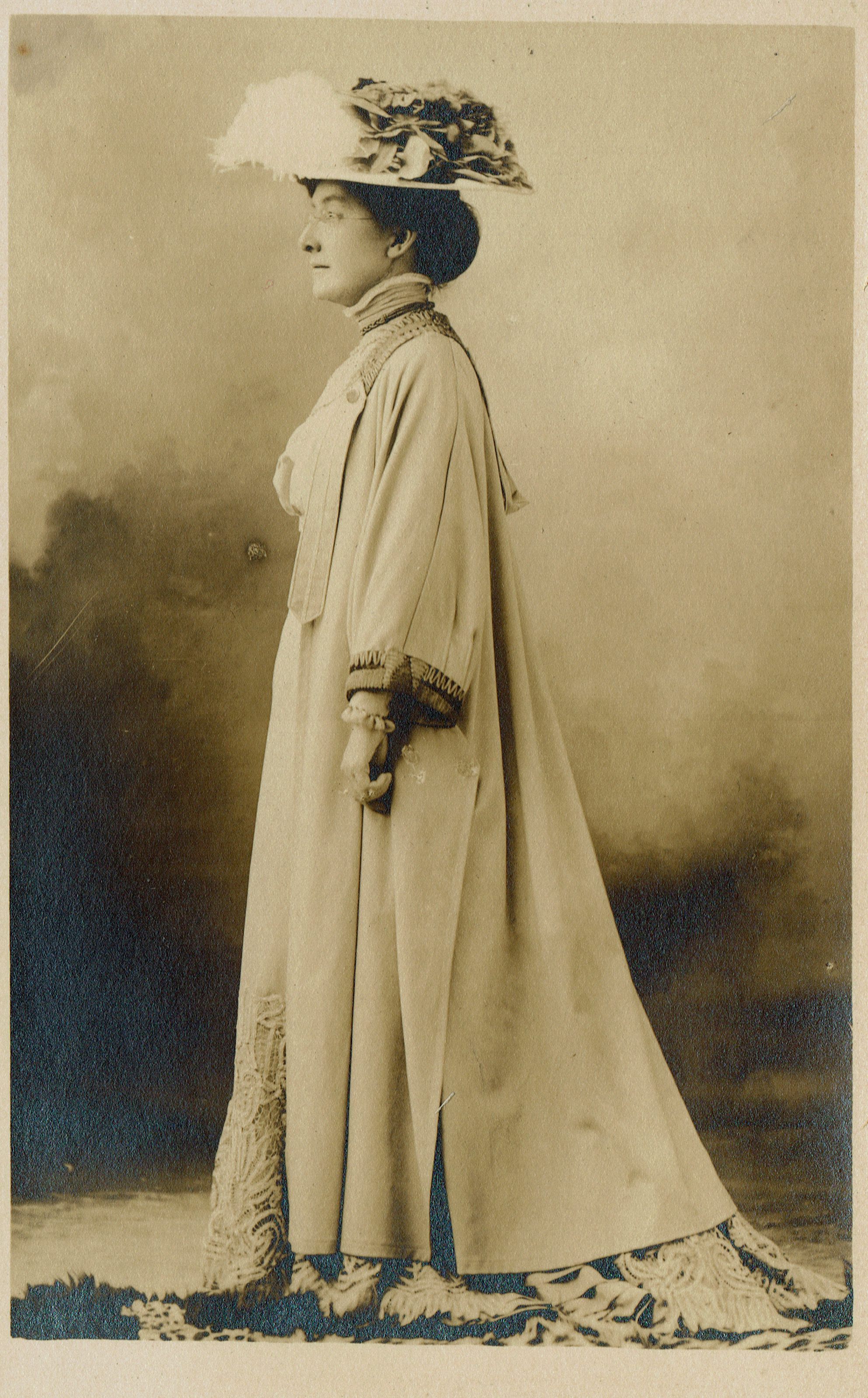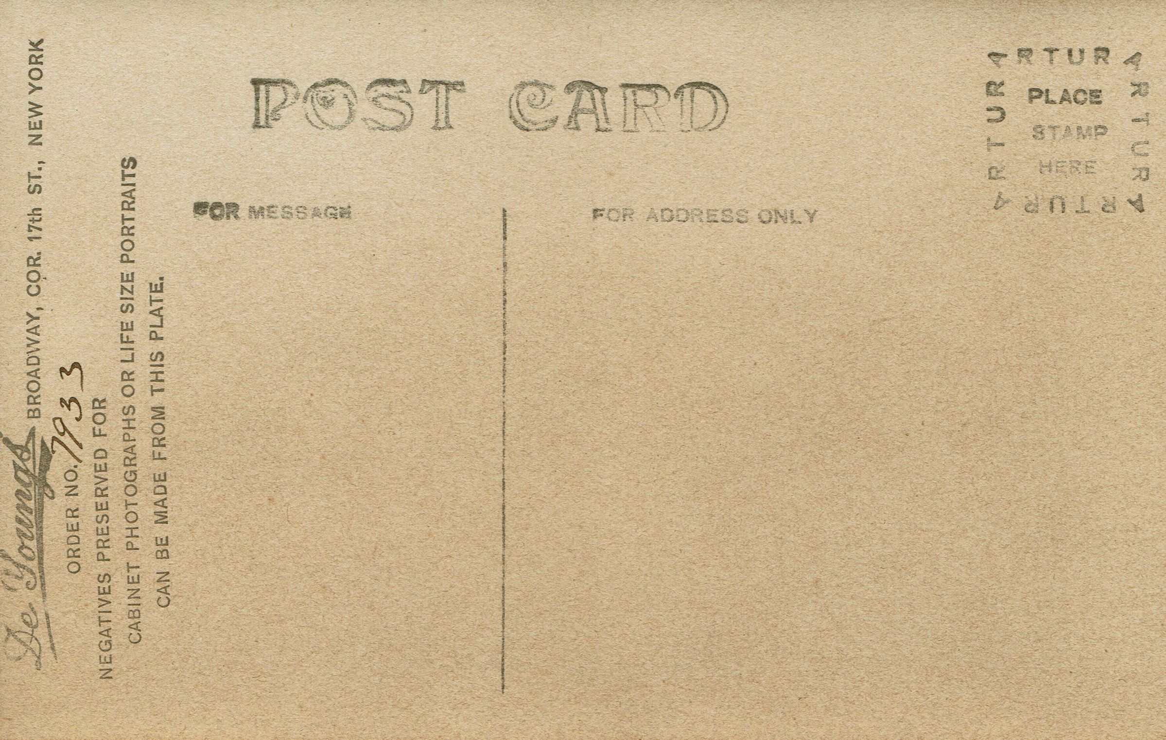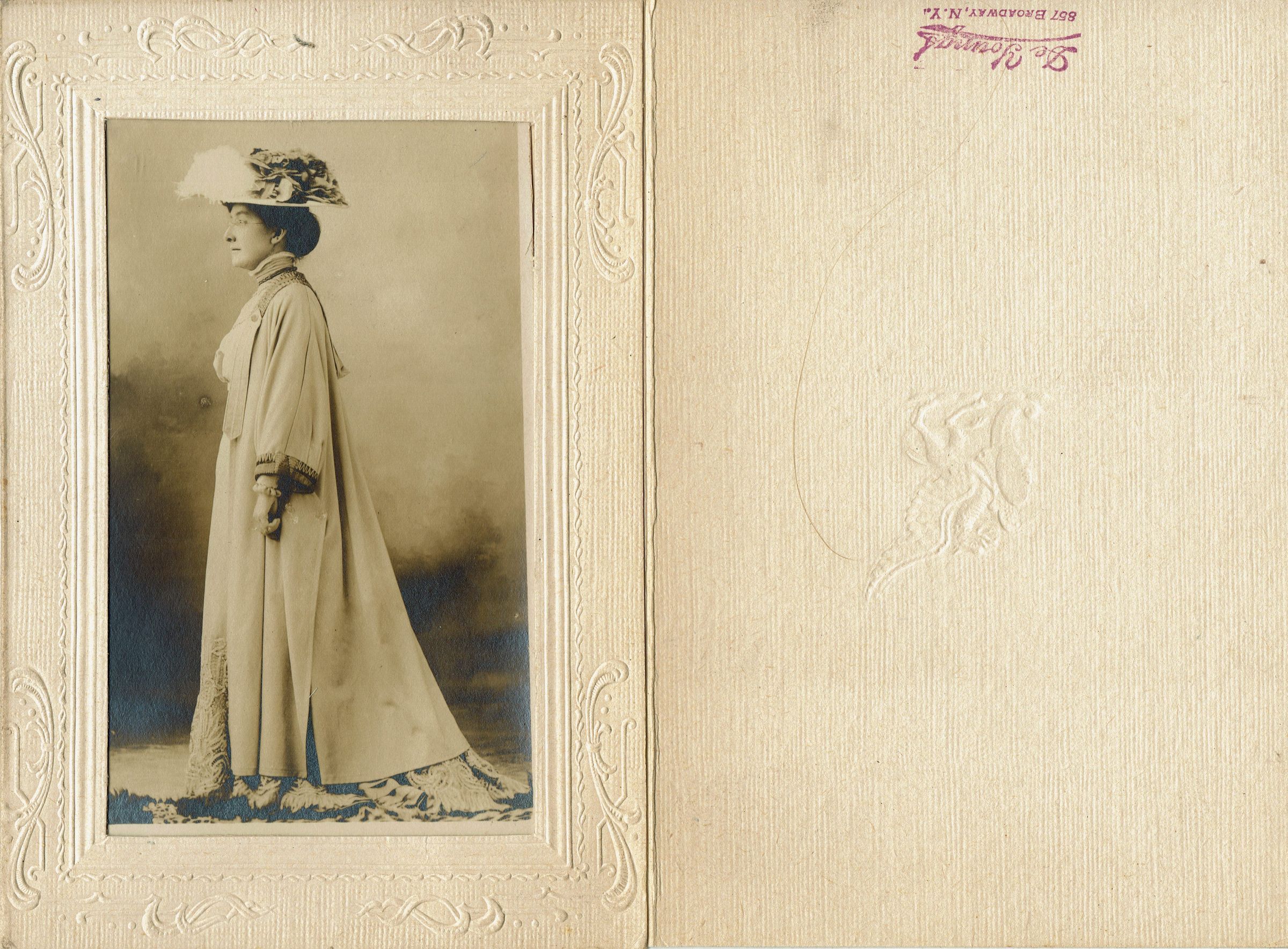 Photograph of Bonnie Snow taken by De Youngs, Broadway, corner of 17th street and printed on a postcard. Postcard in mounted in envelope from De Youngs.Collection