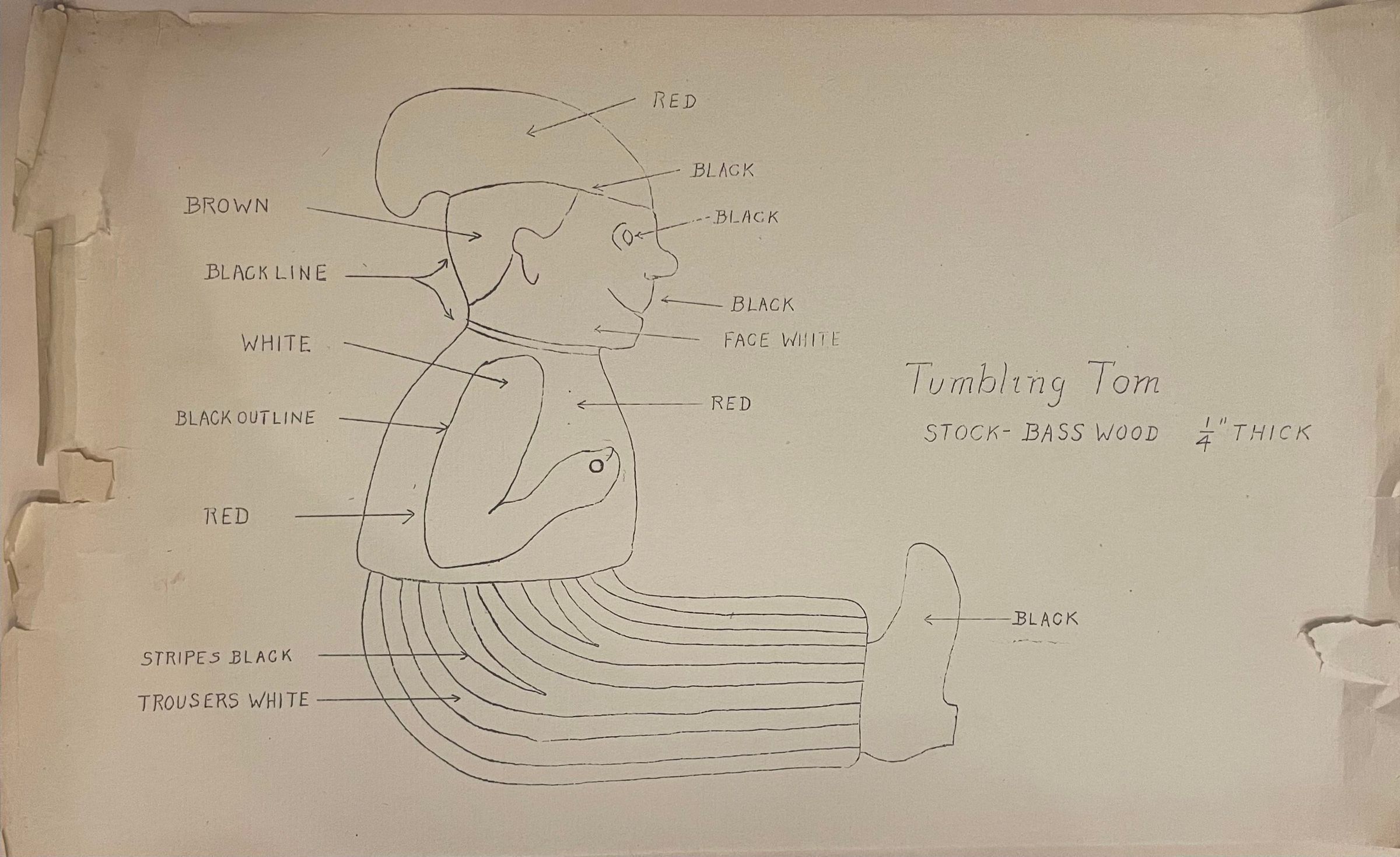 Two copies of "Tumbling Tom" design by Bonnie Snow, with instructions as to what materials (stock-base wood) to and colors (red, black, white, etc) to use. Date unknown.