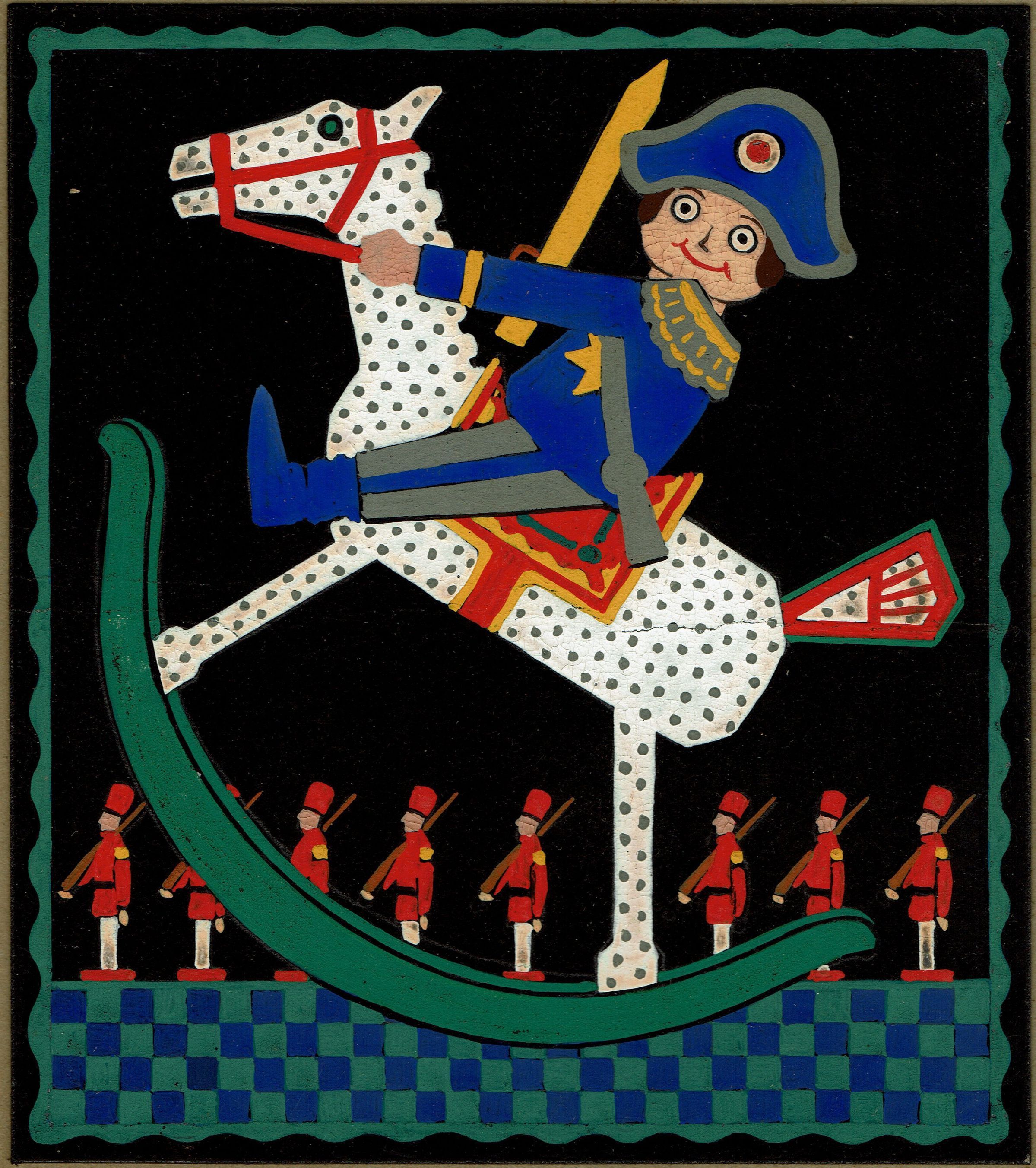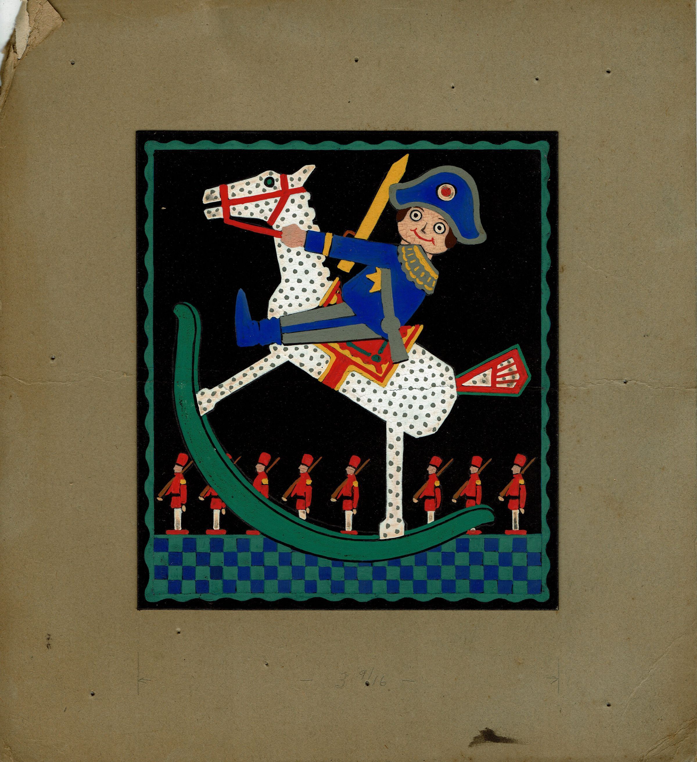 Colorful painting on paper of a toy solider on a rocking horse for the December Insert of Everyday Art Magazine. Bonnie Snow was the editor of the Everyday Art. Painting may be by Snow.