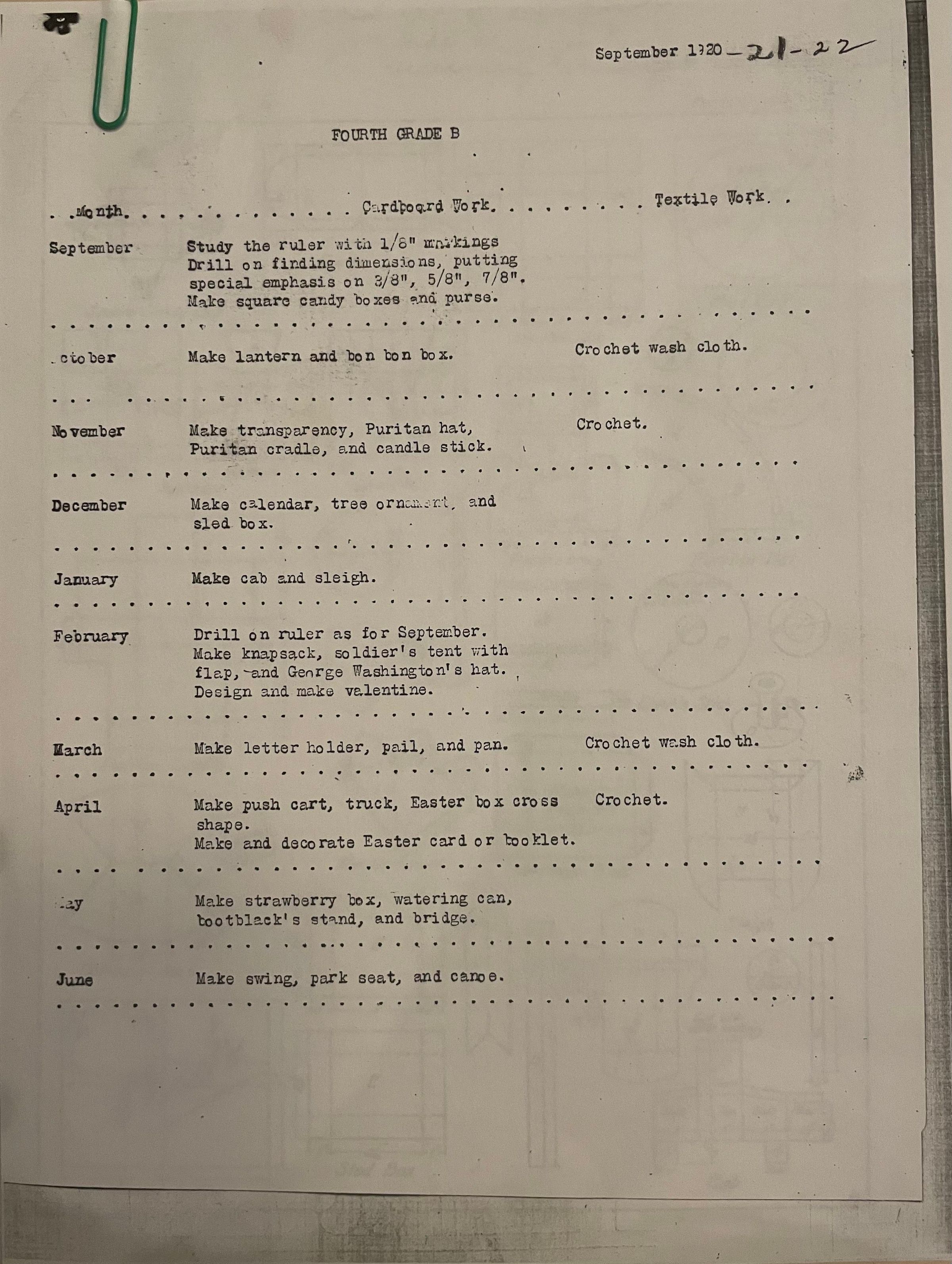 Bonnie Snow's list of different monthly art projects for fourth grade students. Instructions and a list of materials is included. Intended for use between 1920 and 1922.Collection