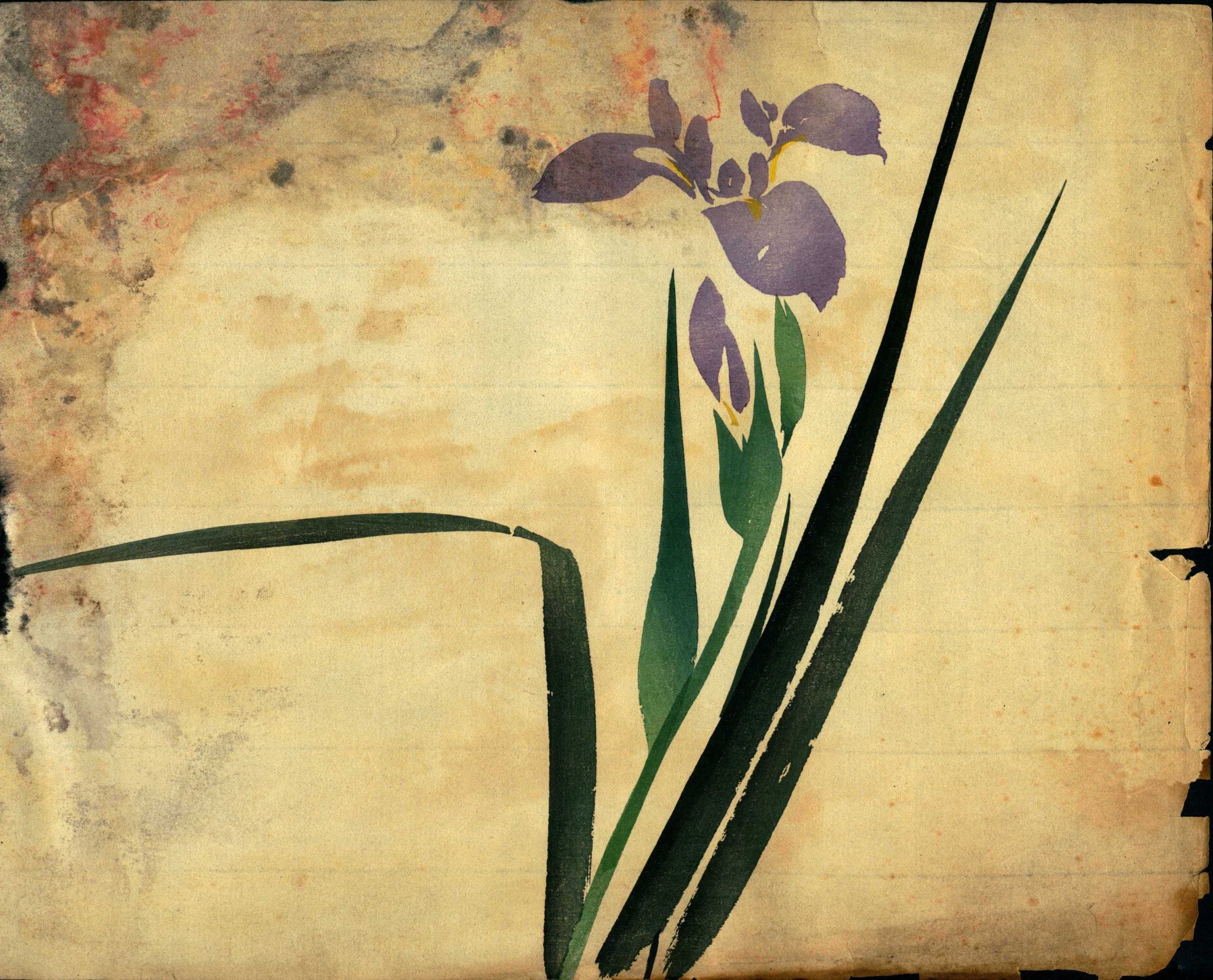 Three color prints done in the style of Japanese woodblock prints in the collection of Bonnie Snow. Artists and dates are unknown. Two prints of branches from fruit trees, one Iris floral print.Collection