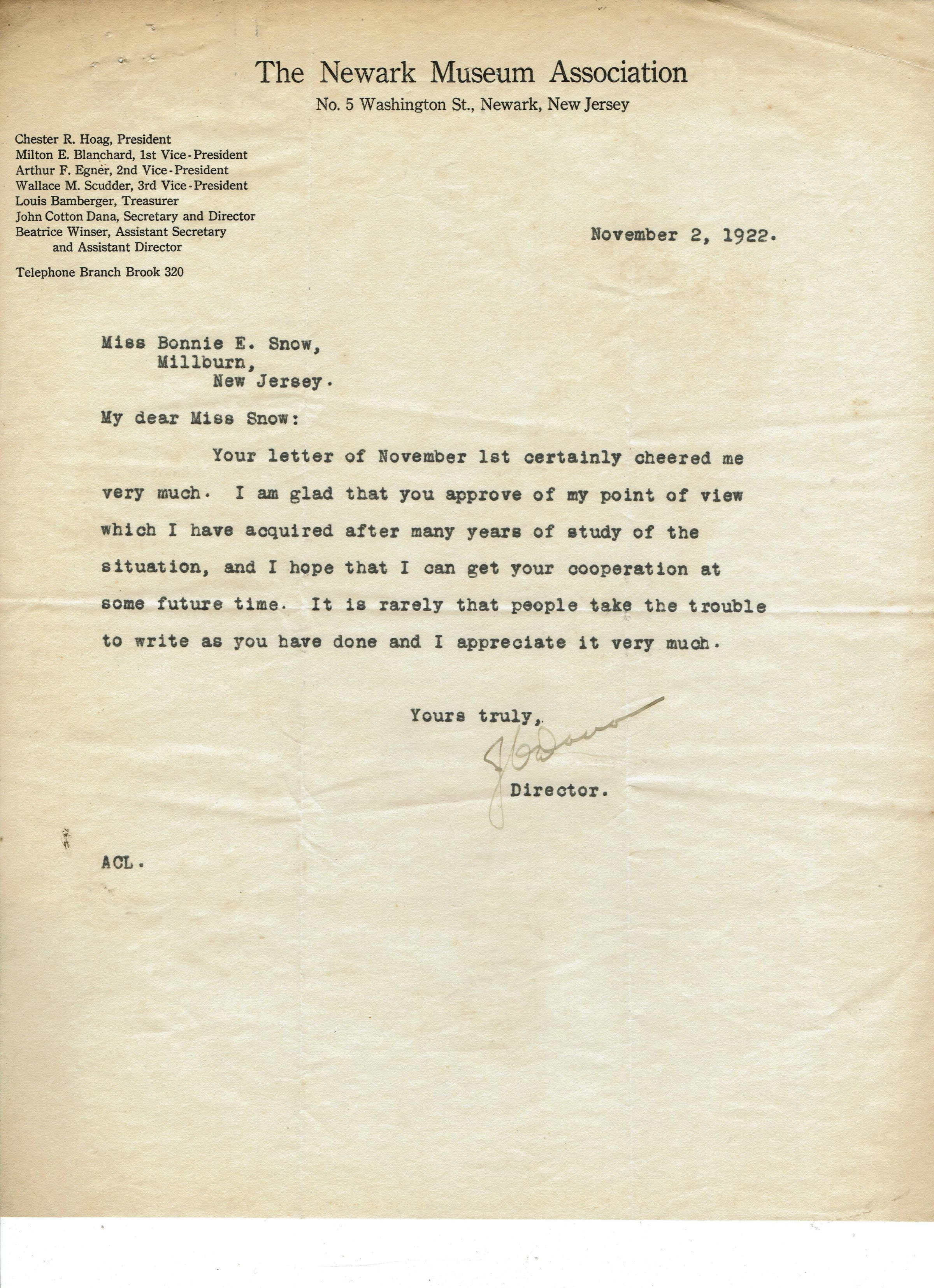 Letter from Newark Museum Director John Cotton Dana to Bonnie Snow dated November 2, 1922.Collection
