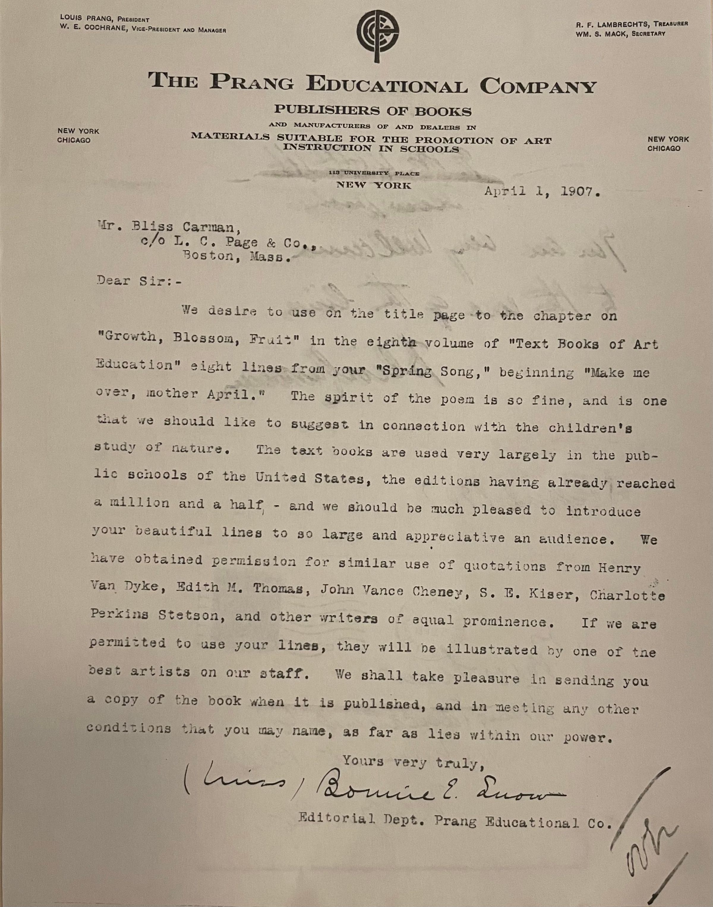 Letter and envelope addressed to the poet Bliss Carman care of the L.C. page & Company (Boston) from Bonnie Snow (of the Prang Educational Company's Editorial Dept), dated April 1, 1907 asking for permission to use lines from the author's poem "Spring Song" in the the 8th volume of "Text Books of Art Education."