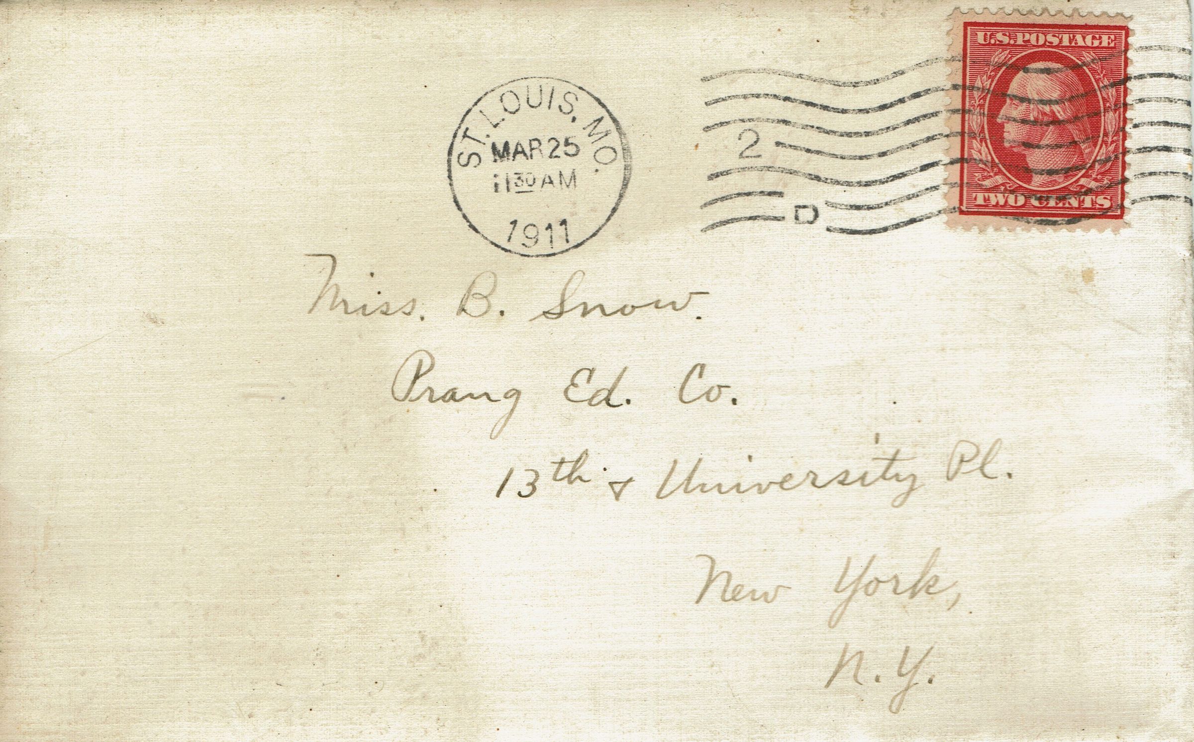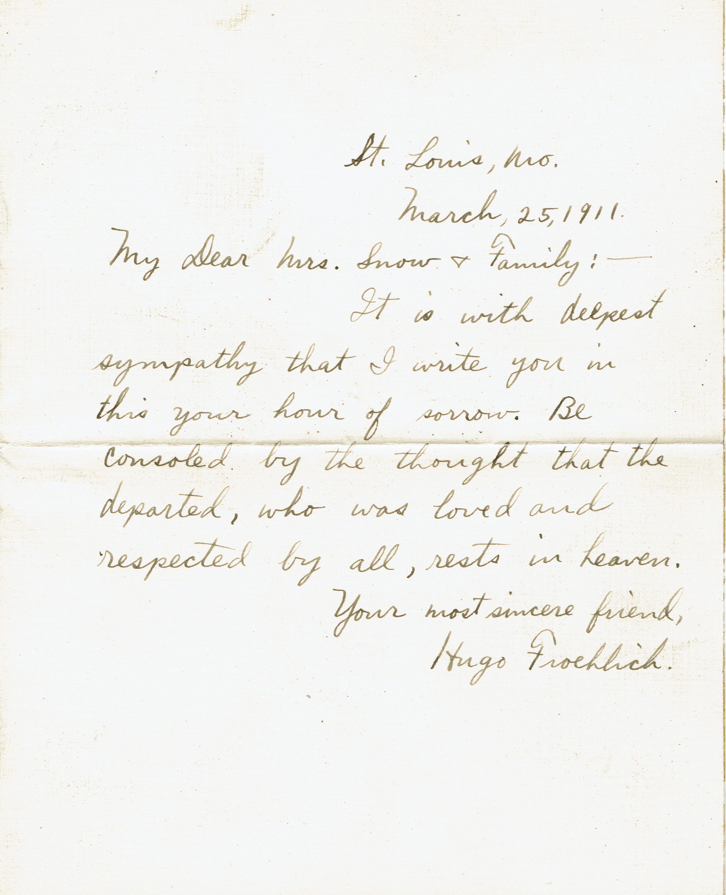 One page letter and envelope. from Hugo Froehlich to Bonnie Snow dated St. Louis, Mo, March 25, 1911 expressing condolences over the death of Winnifred. Envelope is postmarked St. Louis, Mo, March 25, 1911, 11:30 am and address to Miss B. Snow, Prang Ed. Co., 13th and University Place, New York, NY.Collection