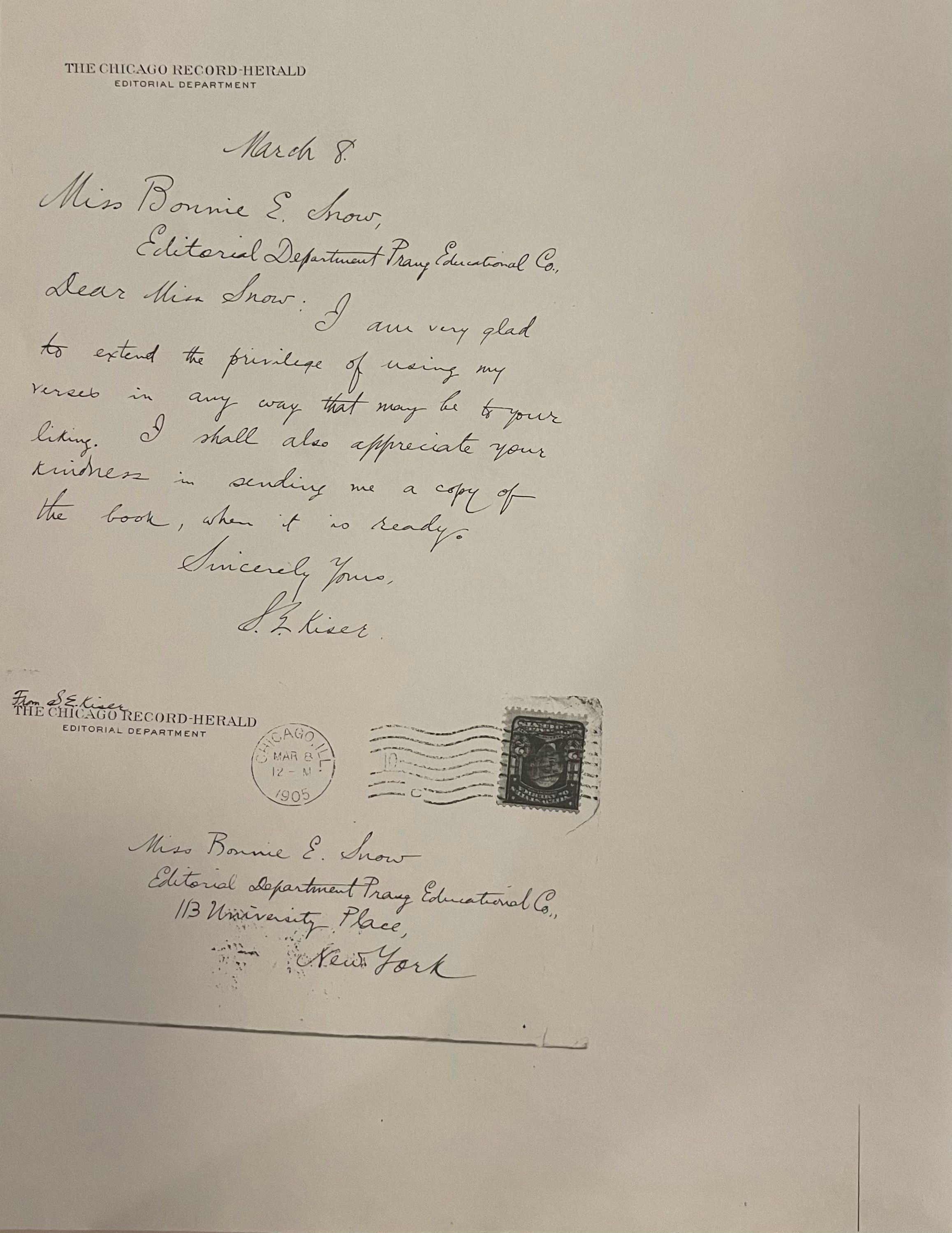There is a scanned letter and envelope addressed to Bonnie Snow from S.(Samuel) E. (Ellsworth) Kiser at the Chicago Record-Herald Editorial Department, dated March 8, 1905, granting Bonnie permission to use his poetry in her publication.Collection