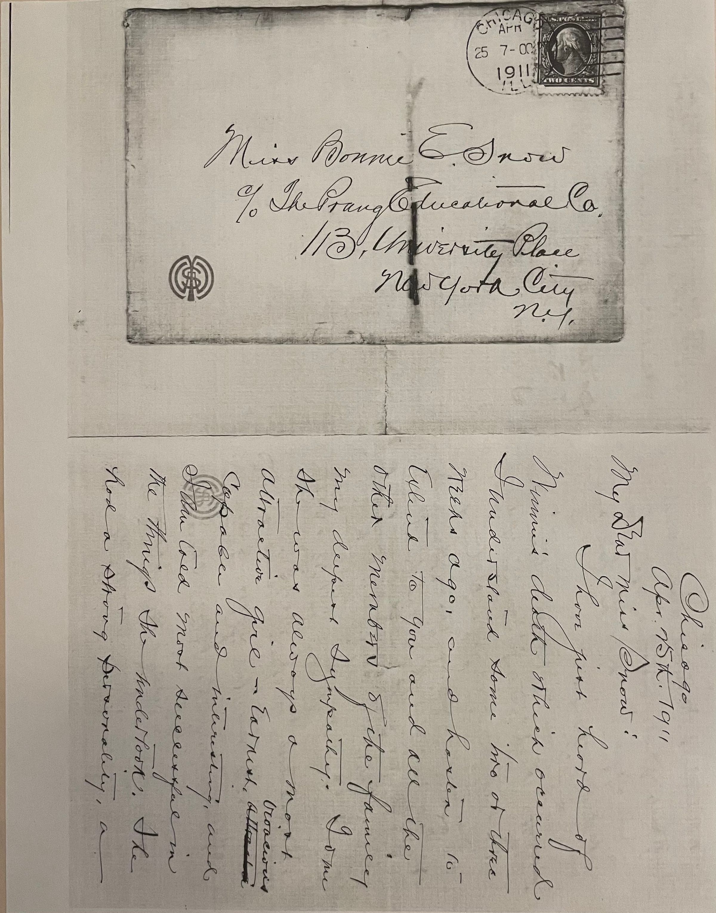 There is a scanned letter and envelope addressed to Bonnie Snow from a friend (Aug S. Mack??), dated April 25, 1911.Acquisition