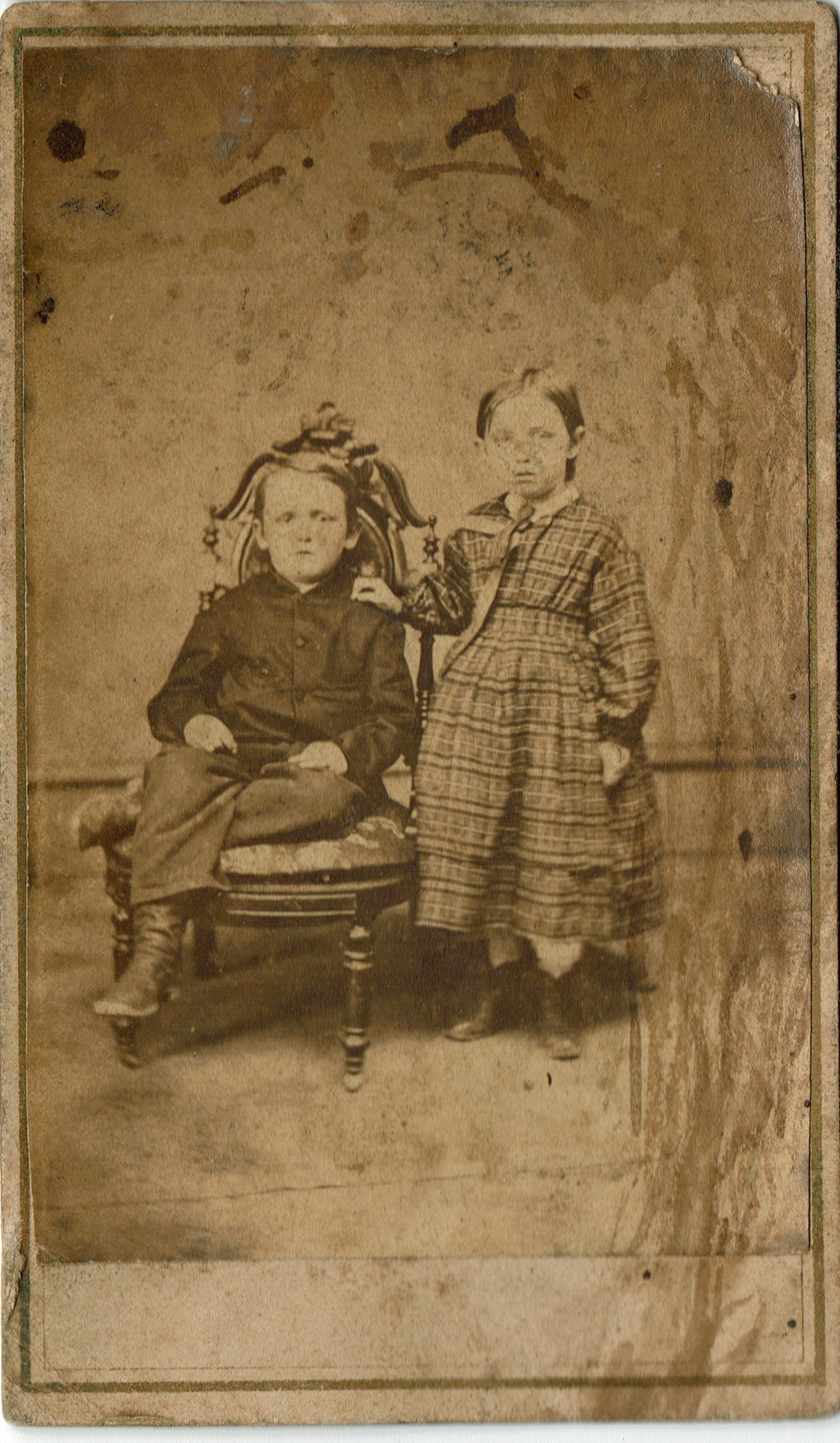 Carte-De-Visite Photograph of a young boy seated in a chair with a young girl in a plaid dress standing beside him. Verso of CDV reads J.A. Fullerton, Photographer, no. 8 Front Street between Main and Centre, Bloomington, Il.
