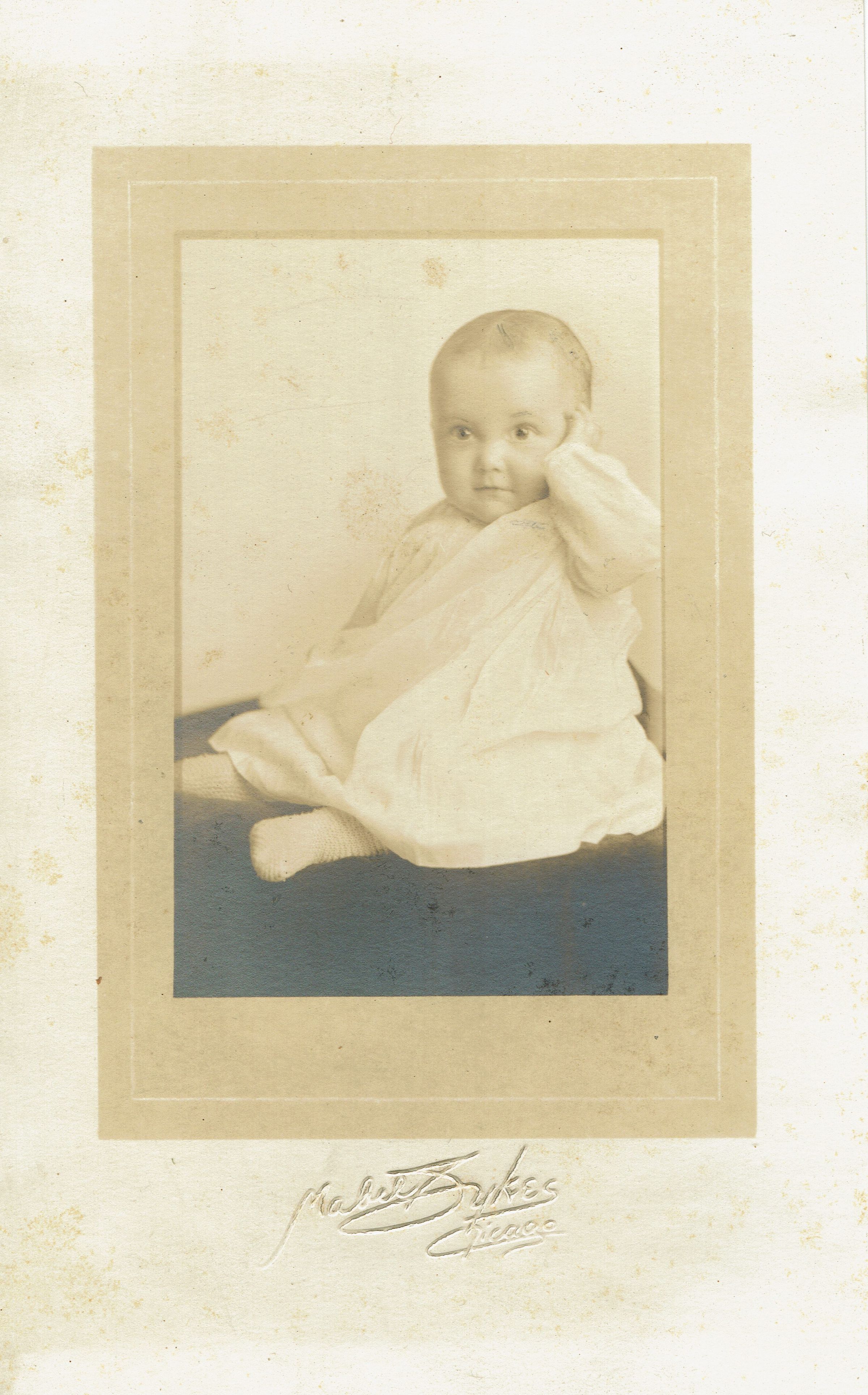 Photograph of unidentified baby on cream paper with the name photographer Mabel Sykes Chicago embossed. Photograph is in a gray portfolio with Mabel Sykes, 140 No State St Chicago, Opposite Field's.Collection