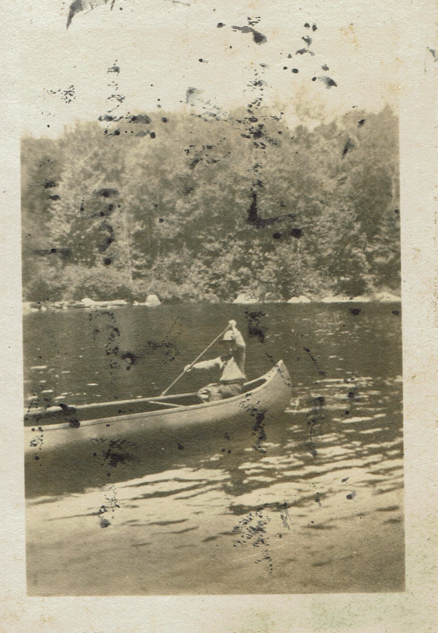 Photograph of a man in a canoe on a lake. No identification of person or location.Collection