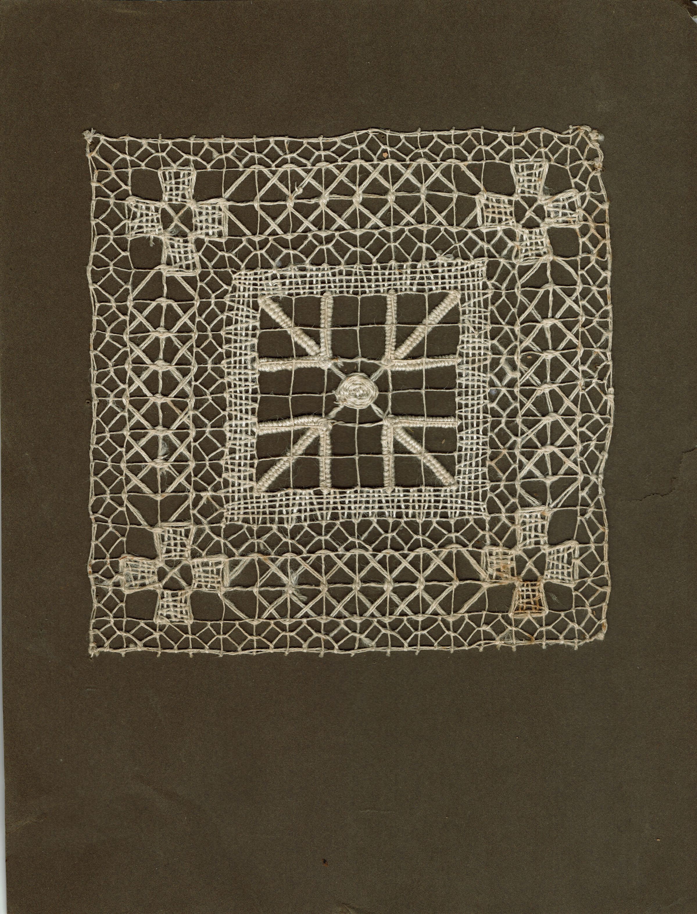 Sample needlework design, cream thread mounted on brown paper. Probably part of a school art exhibition mounted by Bonnie Snow.Collection
