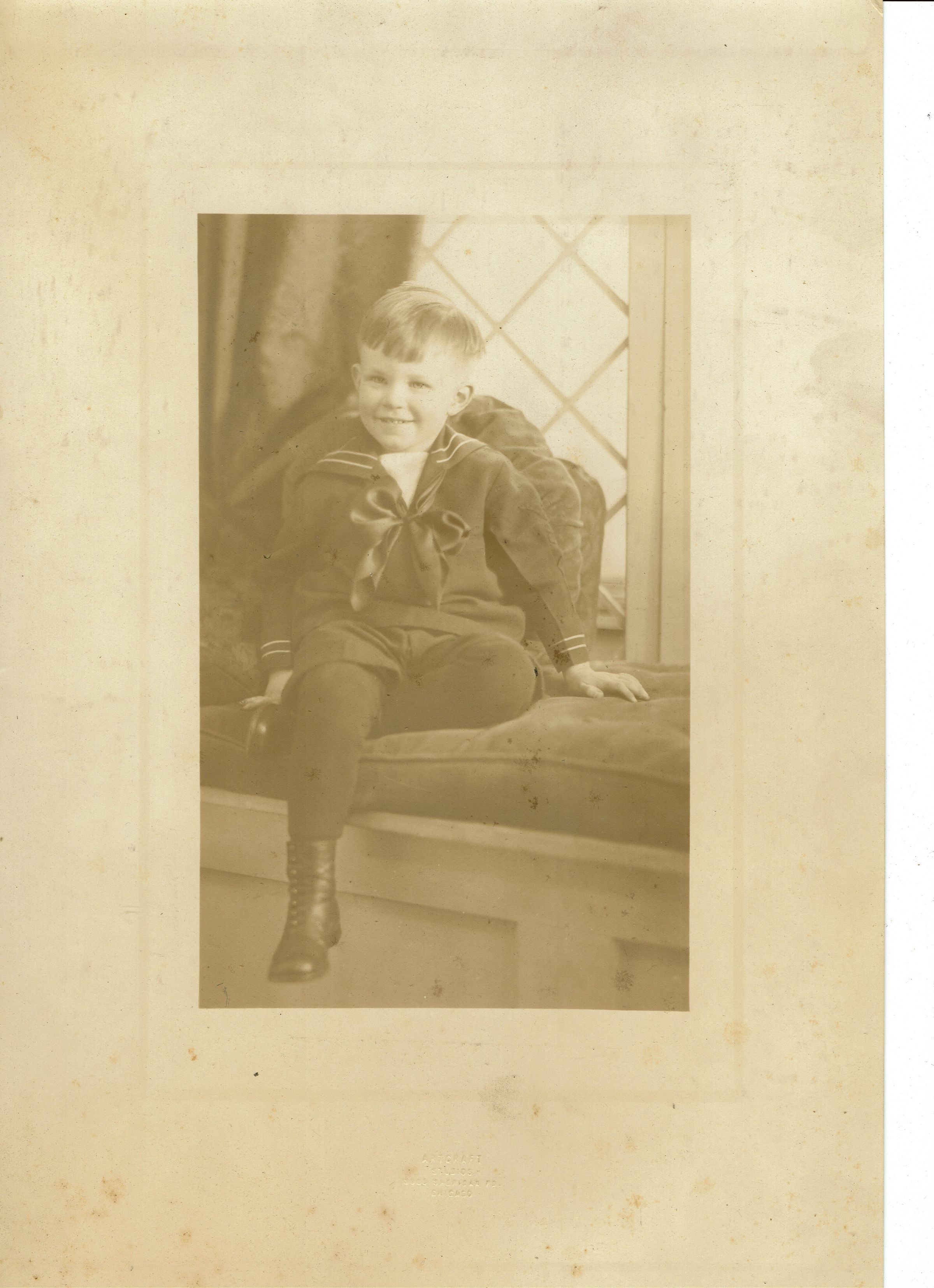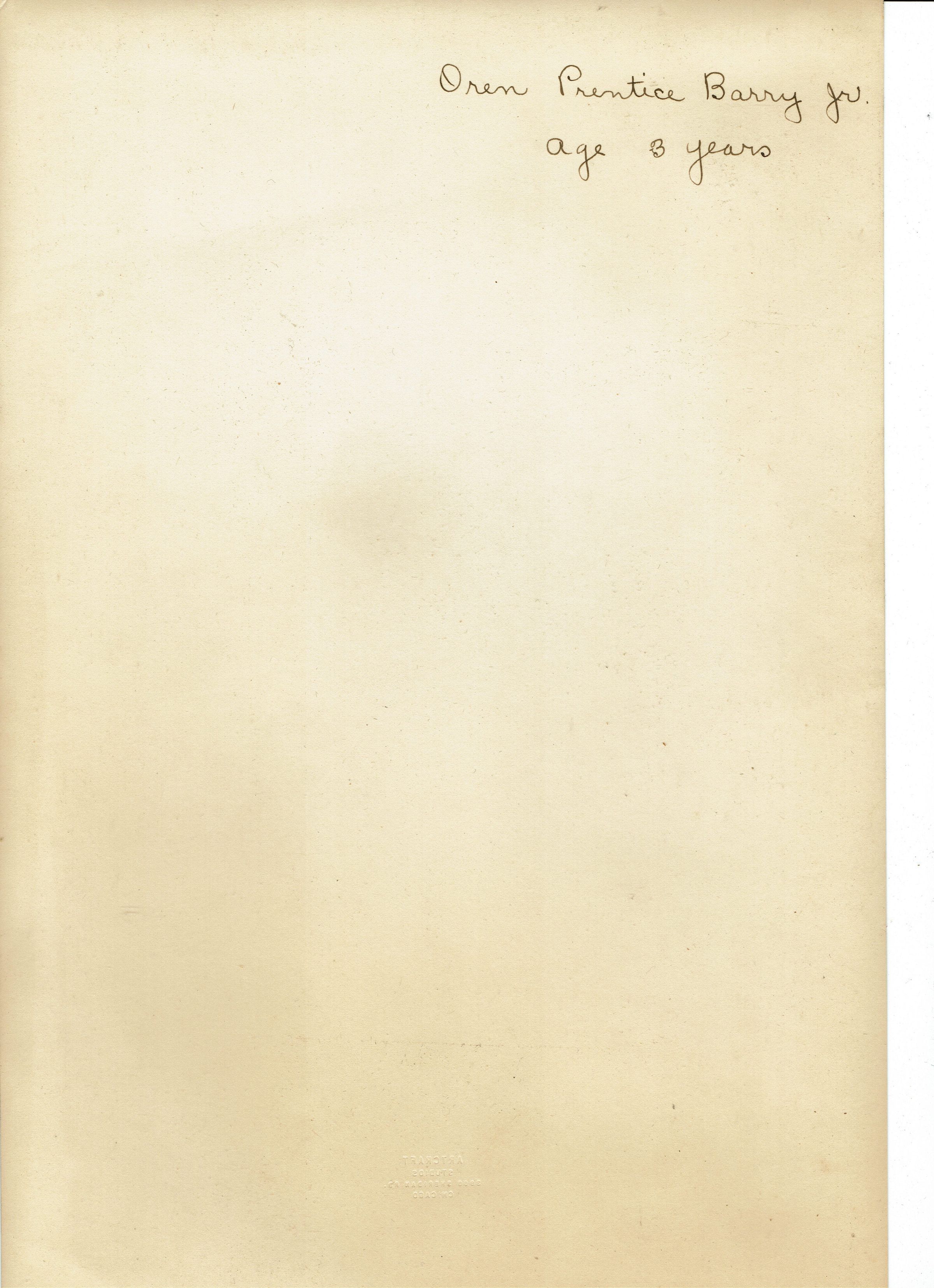 Photograph of Oren Prentice Barry, Jr. printed on cream paper with Art Craft Studios, 3900 Sheridan Road, Chicago. Identification on verso of photograph also states 3 years old. Photograph is in a portfolio that reads F.S. Winslow, Art Craft Studios, Inc., 3900 Sheridan Road, Chicago. Oren Prentice Barry, Jr. was the grandson of Emma Snow Barry, Bonnie Snow's sister.