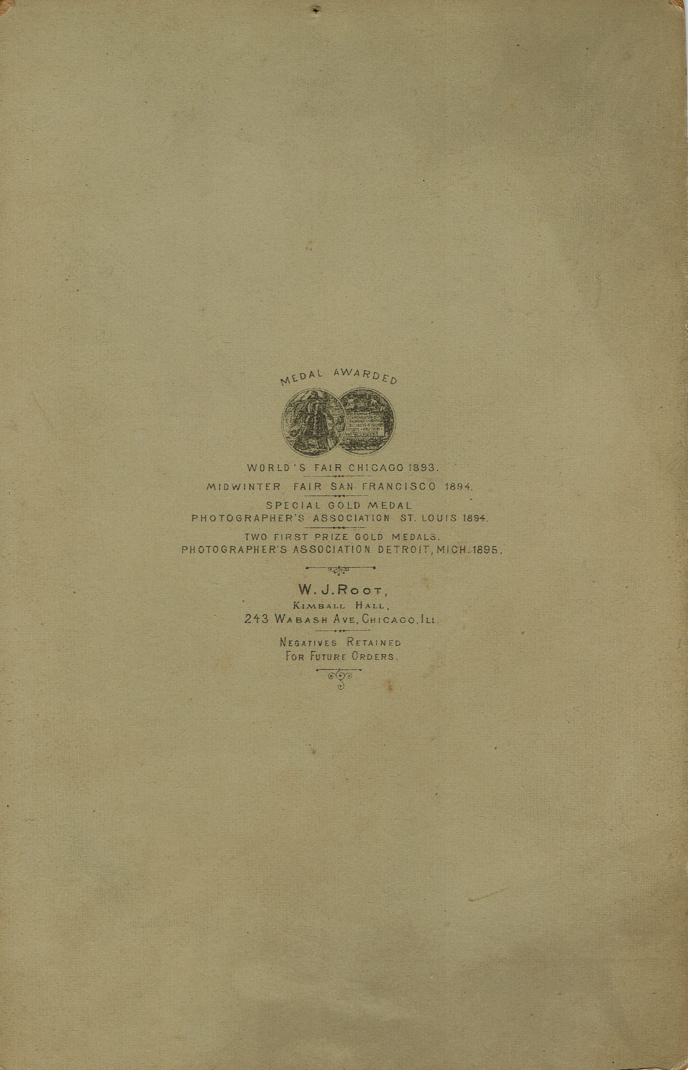 One of three photographs of unknown male taken by different photographers. This photograph was taken by W.J. Root, 243 Wabash Avenue, Chicago.Photograph Details