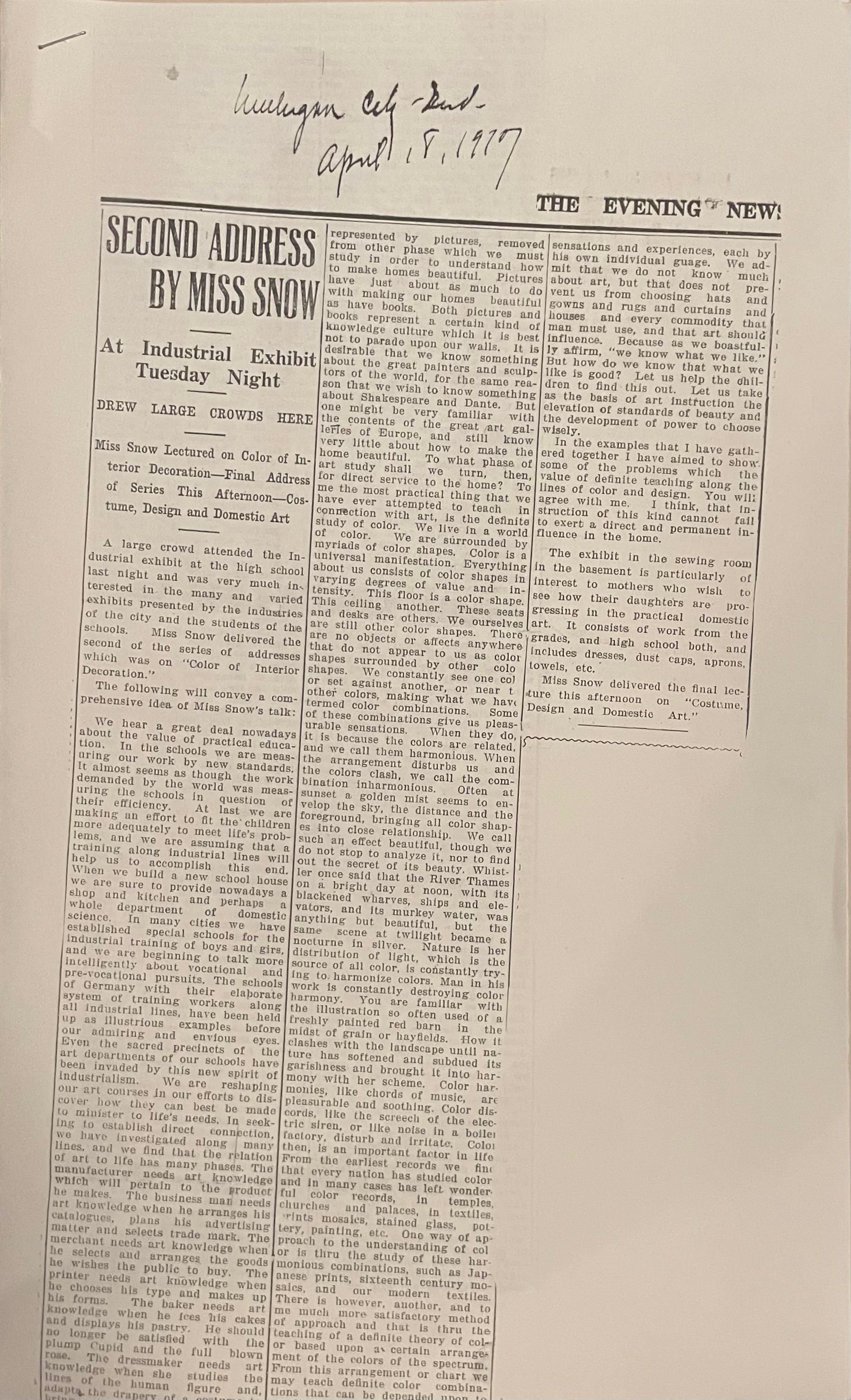 The two page "Second Address by Miss Snow at Industrial Exhibit Tuesday Night" talks about how Miss Snow lectured on colour of interior decoration.Acquisition