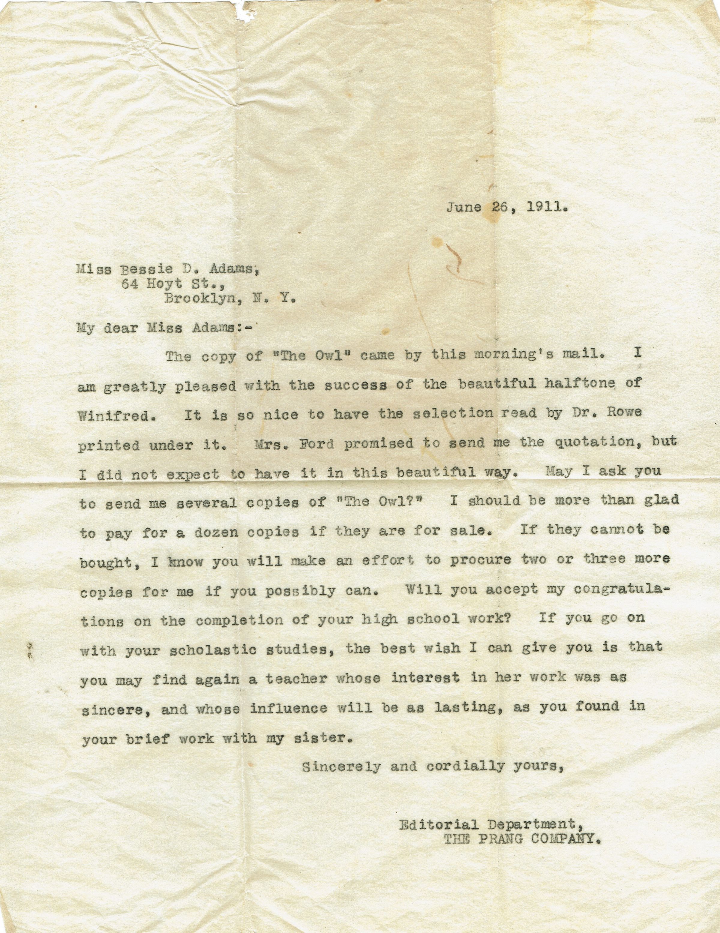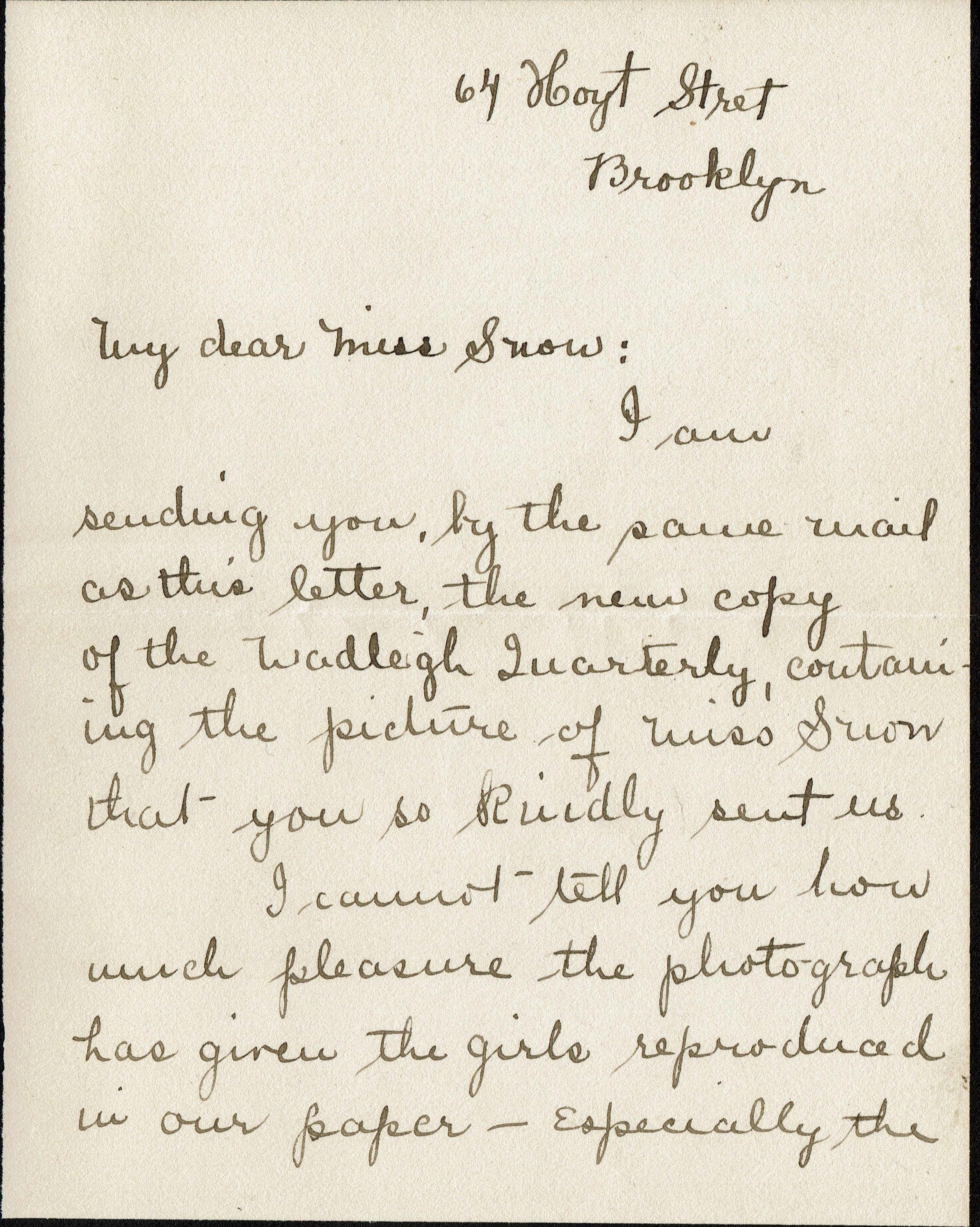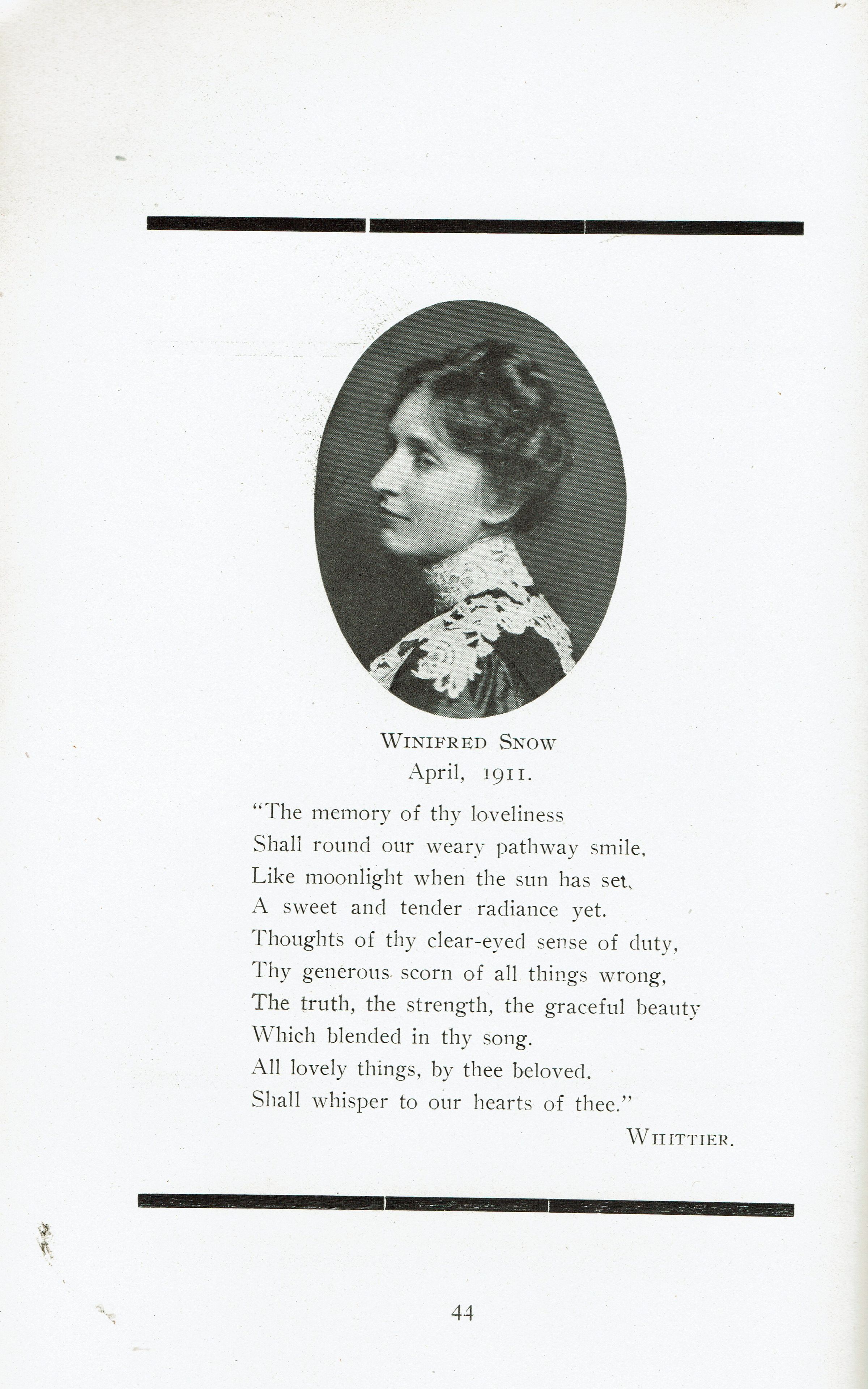 Quarterly publication from the Wadleigh High School, New York City.62 pp., plus advertisements. Illustrated with B&W photographic plates, prints and illustrations. Features a tribute poem to Winifred Snow, sister of Bonnie Snow, on page 44. There are also two letters about the publication.Collection