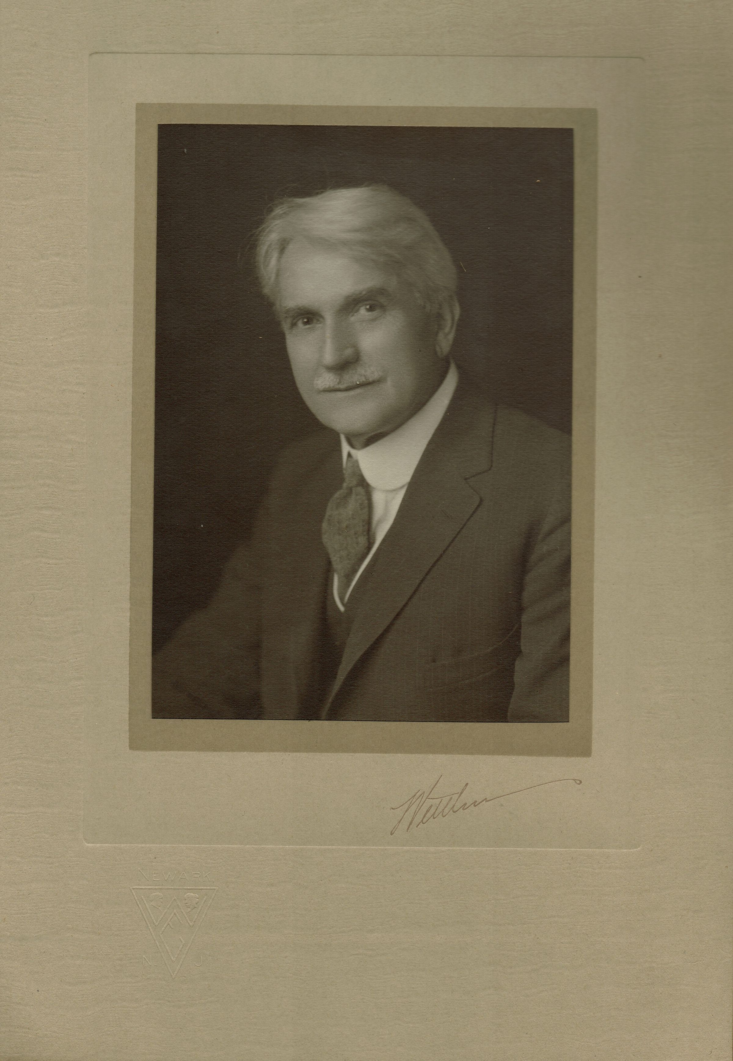 Photograph of unidentified man mounted on gray card with embossed photography studio logo, the words Newark, N.J. and signed by photographer Wettlin (George F. Wettlin, active in Newark, N.J. 1914-1940s).Collection