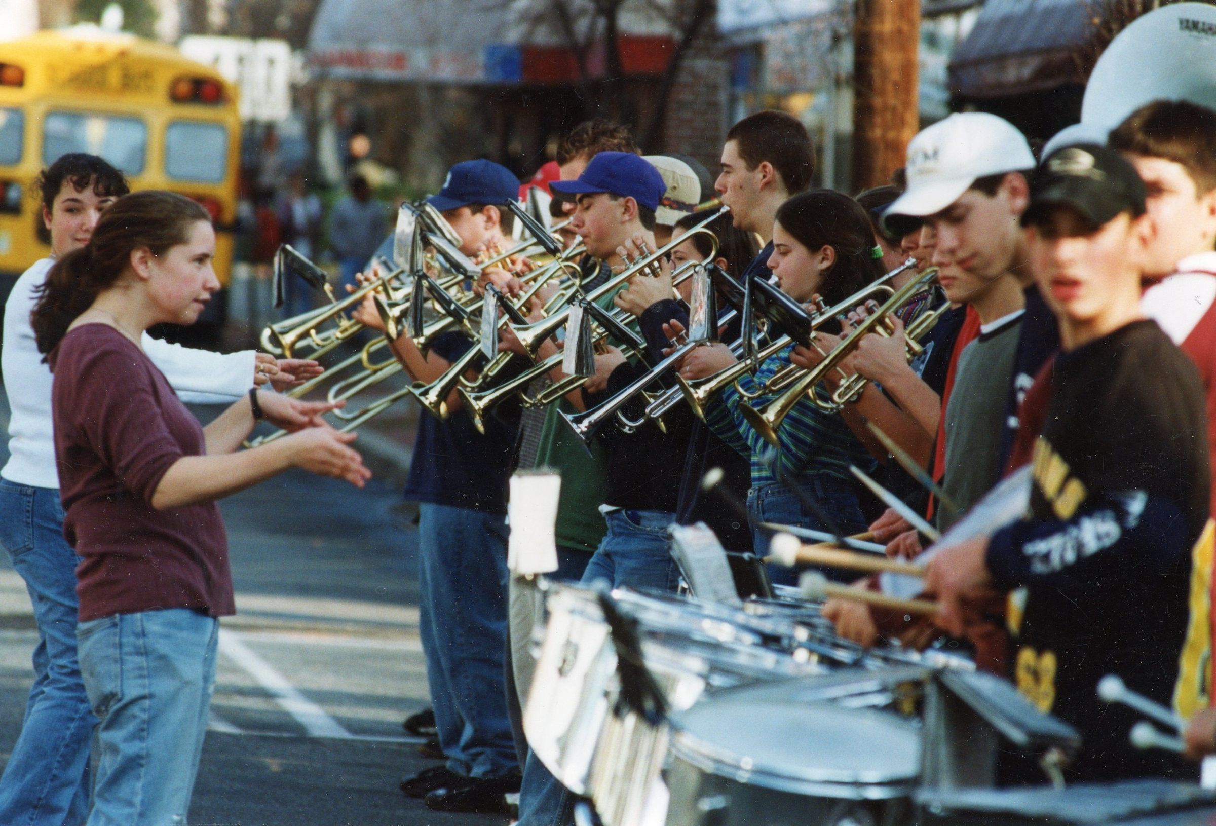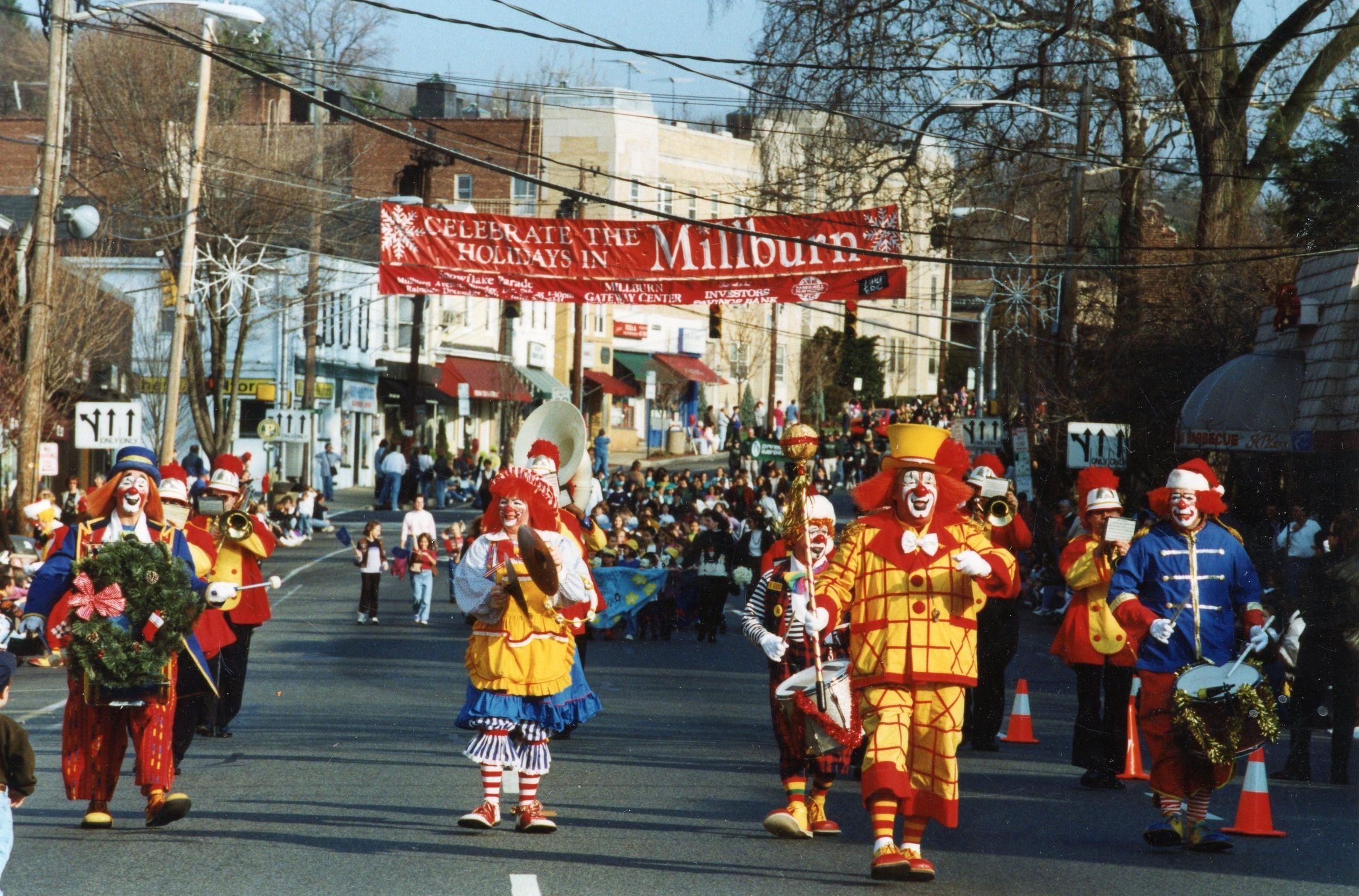 Photographs of the Snowflake Parade on Millburn Avenue, December 6, 1998. First photograph features the "Fun Factory Clowns." Second Photograph shows the Millburn High School Marching Band Playing for the Parade.Acquisition