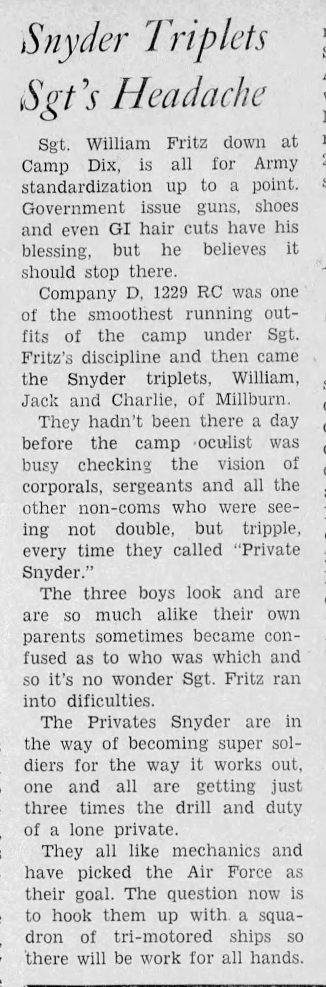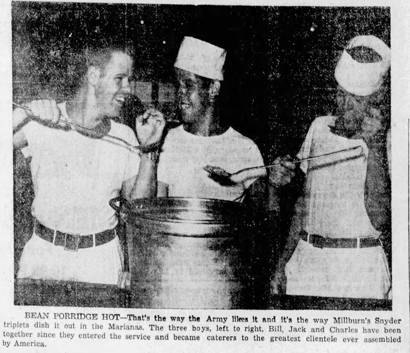 B/w press photo of the Snyder triplets, Bill, Jack, and Charles in the Mariana Islands, 1945. Label on the back of the photo states: "THREE COOKS DON'T SPOIL THE BROTH; MARIANAS--Too many cooks don't spoil the broth, and the Snyder triplets can prove it. All three are mess hall cooks at a B-29 unit of the 21st bomber command in the Marianas.
