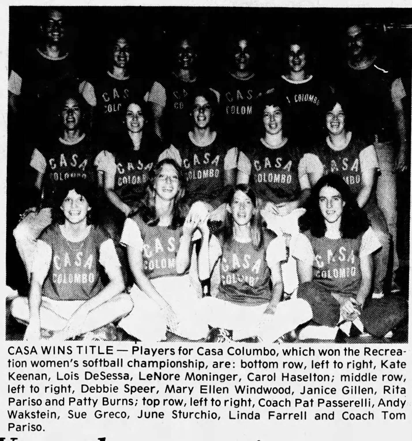 Photograph of the 1979 Casa Colombo Women's Softball Team, which won the Recreation women's softball championship. Pictured in the photograph are: bottom row, left to right: Kate Keenan, Lois DeSessa, LeNore Moninger, Carol Haselton; middle row, left to right, Debbie Speer, Mary Ellen Windwood, Janice Gillen, Rita Pariso and Patty Burns; top row, left to right, Coach Pat Passerelli, Andy Wakstein, Sue Greco, June Sturchio, Linda Farrell and Coach Tom Pariso.Collection