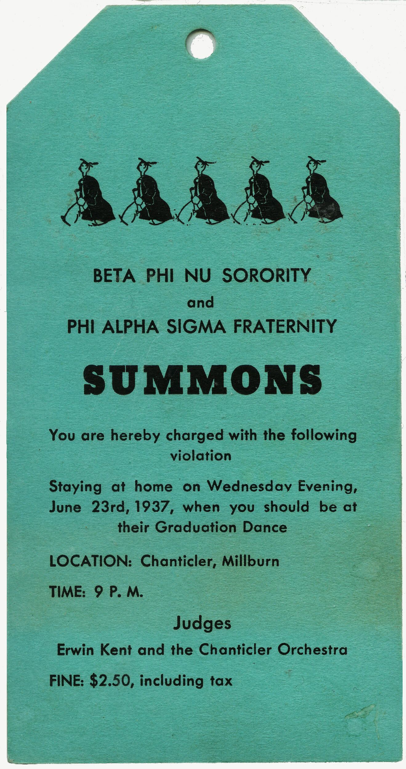 This invitation was in a scrapbook purchased at an estate sale. The young woman who created the scrapbook kept memorabilia from events at her school (secretarial? junior college?). Corners are bumped and edges show light wear. The June 23, 1937 graduation dance to which guests were invited was at the Chanticler in Millburn, at 9:00 pm. The invitation looks like a ticket, is teal-colored, and has light overall soiling. The back has faint evidence of having been glued to the page of the scrapbook.Acquisition