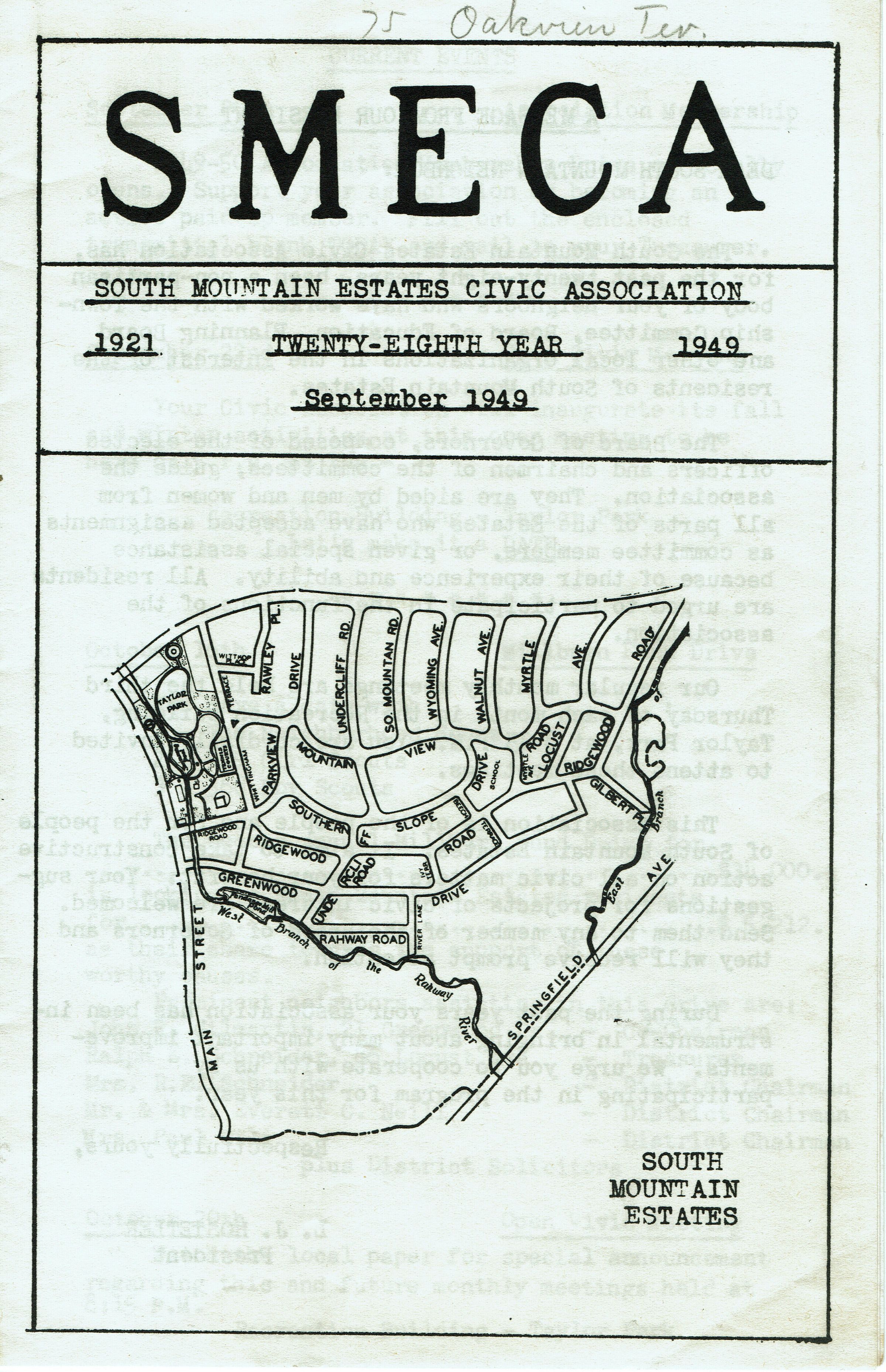South Mountain Estates Civic Association Newsletter, September 1949. 28th Year. 8 pages. Contains a message from the Association President, L.J. Hostetler, description of current events from 1949-50, list of the SMECA Board of Governors, membership information. Newsletter belonged to resident of 75 Oakview Terrace (written on front cover).Acquisition