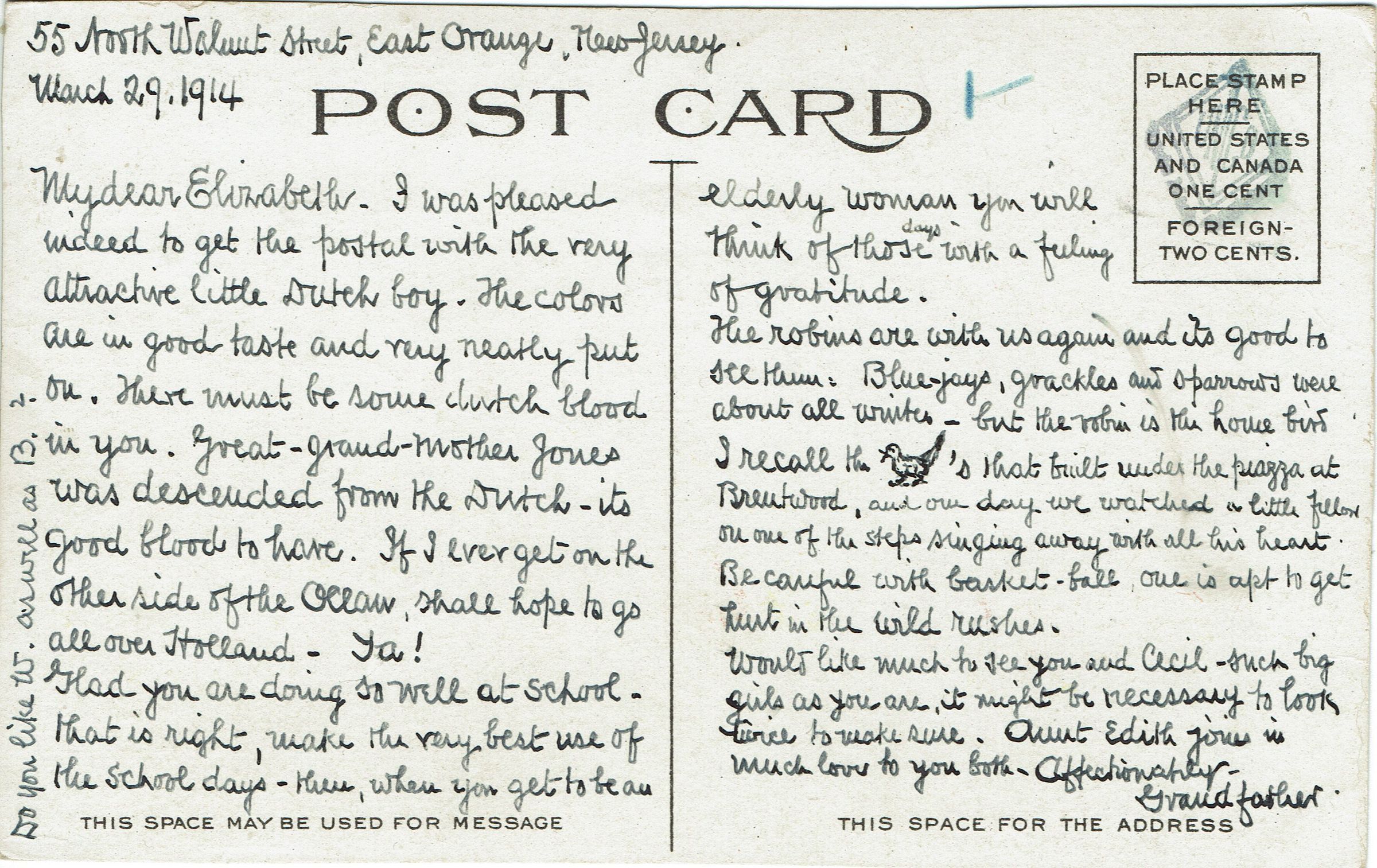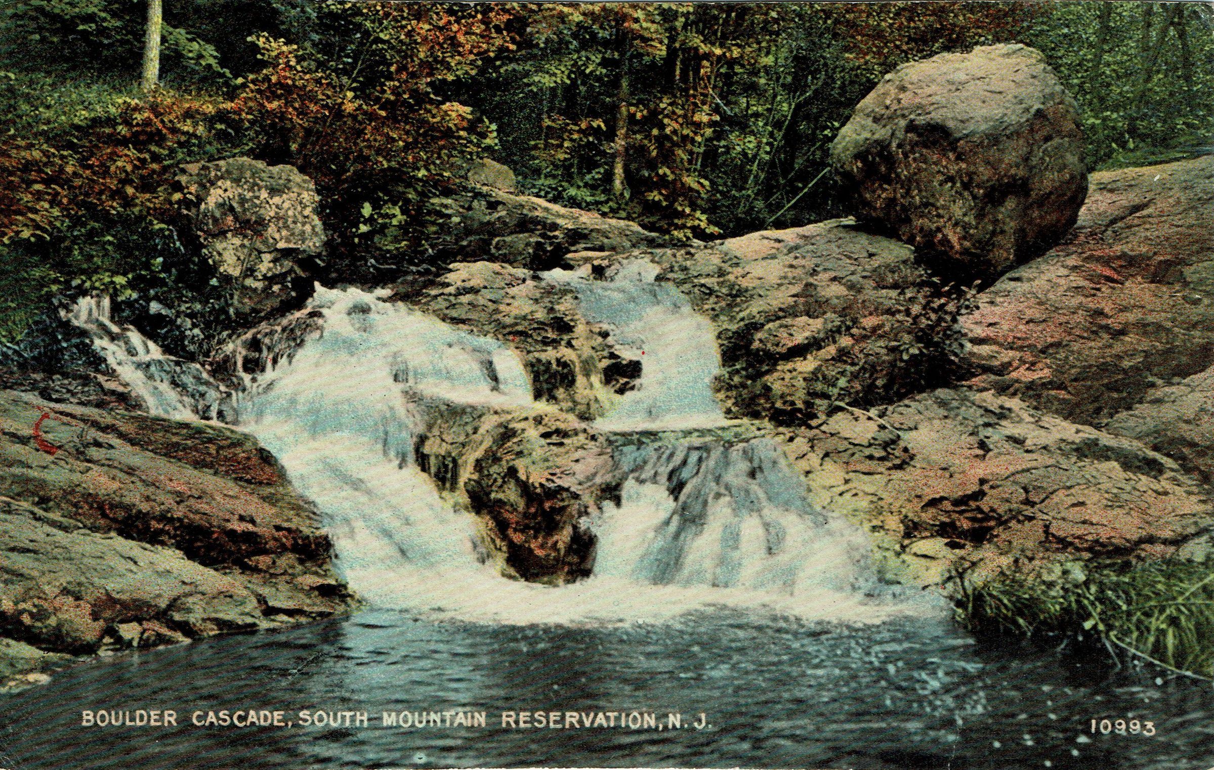 Postally unused, color postcard of a Boulder Cascade in South Mountain Reservation, NJ. Postcard contains a long message written from "Grandfather" at 55 North Walnut Street, East Orange, New Jersey dated March 29, 1914.Collection