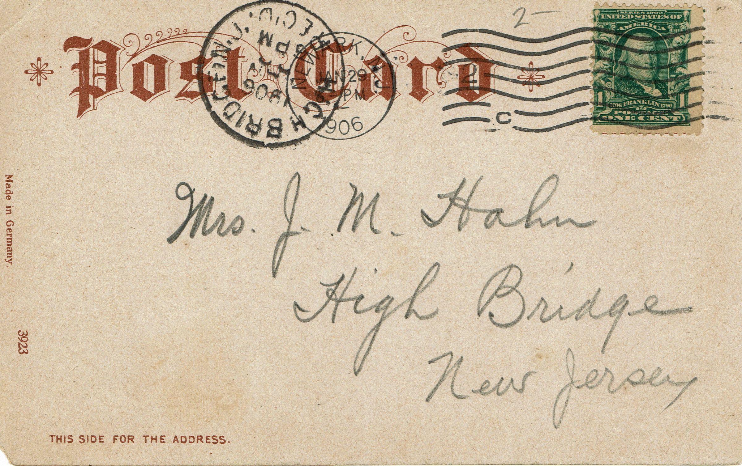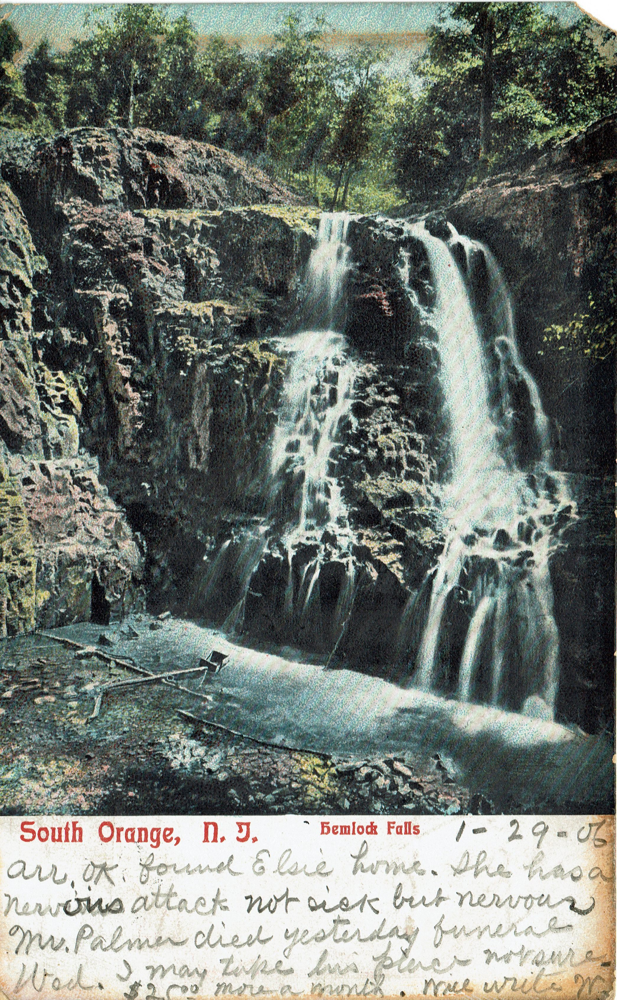 Postally used color postcard of Hemlock Falls in the South Mountain Reservation. Card is dated January 29, 1905 and postmarked Newark, January 29, 1906, 4:00 pm. Card is addressed to Mrs. J.M. Hahn, High Bridge, New Jersey.Collection