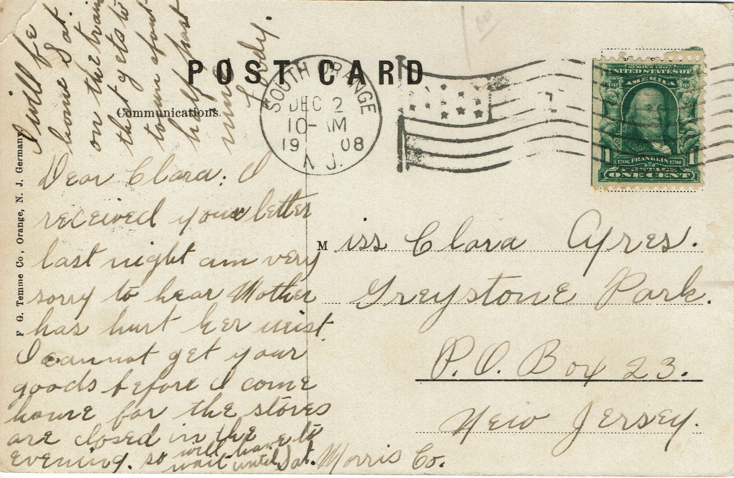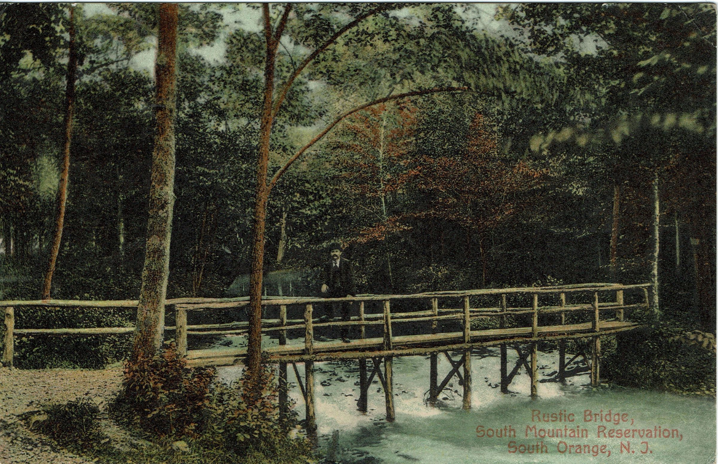 Hand colored, postally used postcard of a rustic bridge in South Mountain Reservation, South Orange, NJ. Postmarked December 2, 1908, 10 am and addressed to Miss Clara Apres, Greystone Park, P.O. Box 23, New Jersey.Collection