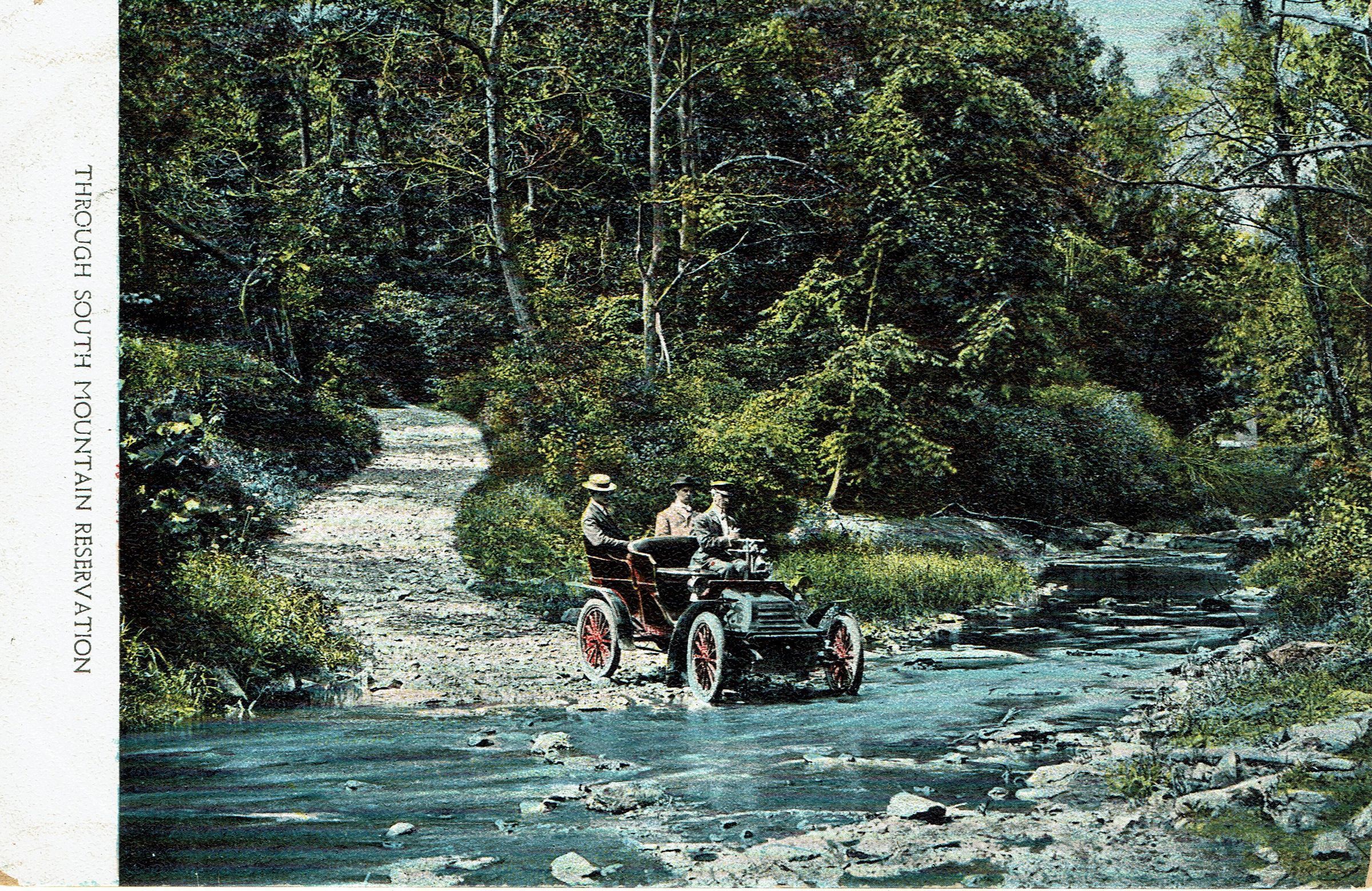Postally unused color postcard of three men in a car crossing a stream in the South Mountain Reservation. Picture is most likely a fantasy, as crossing the Rahway river in a vehicle would have been ill-advised. Colorized version of 2014.035.001.Collection