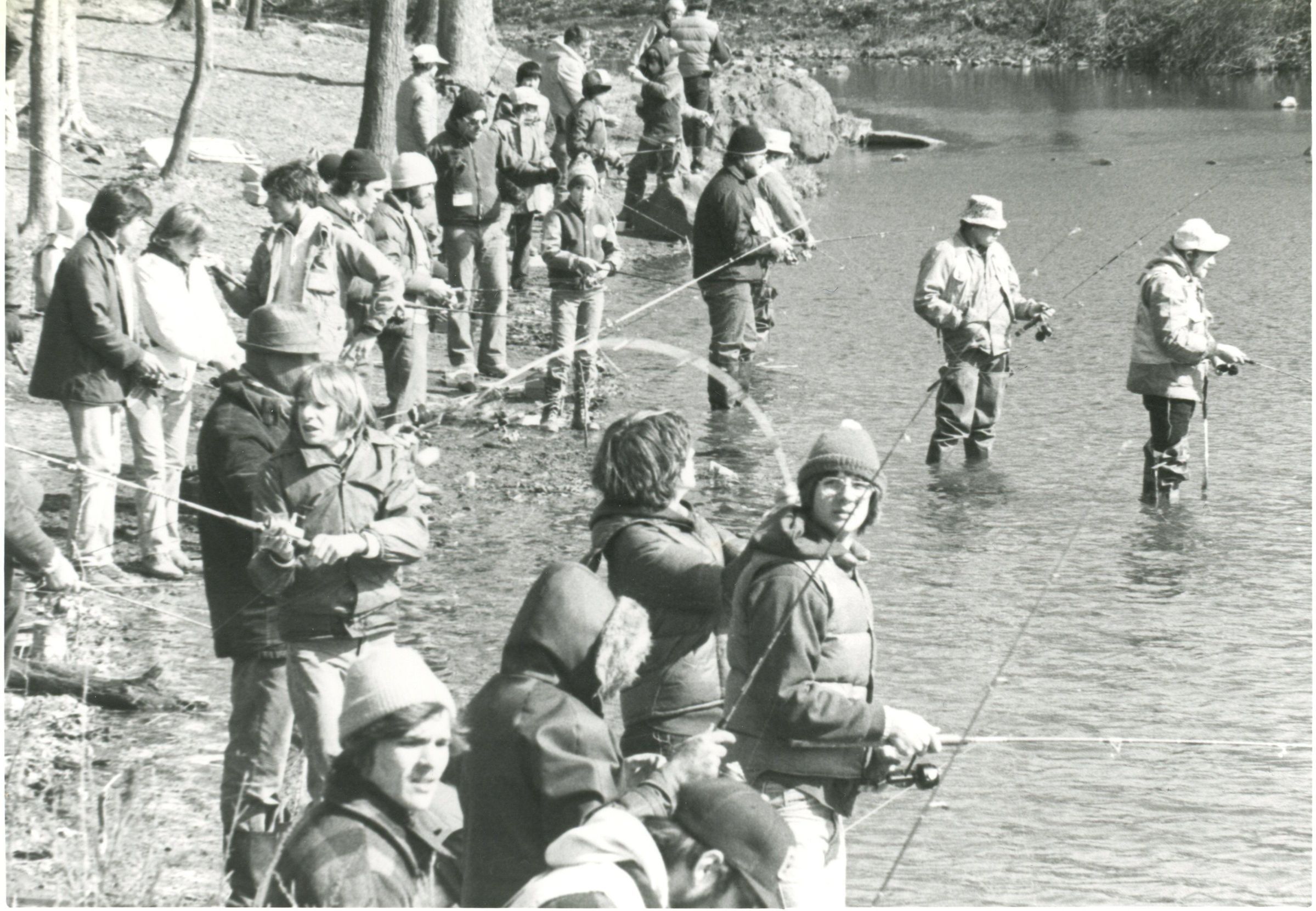 Photograph of opening day of trout fishing season showing anglers at Diamond Hill Pond in South Mountain Reservation, published in the Item on April 12, 1979.Collection
