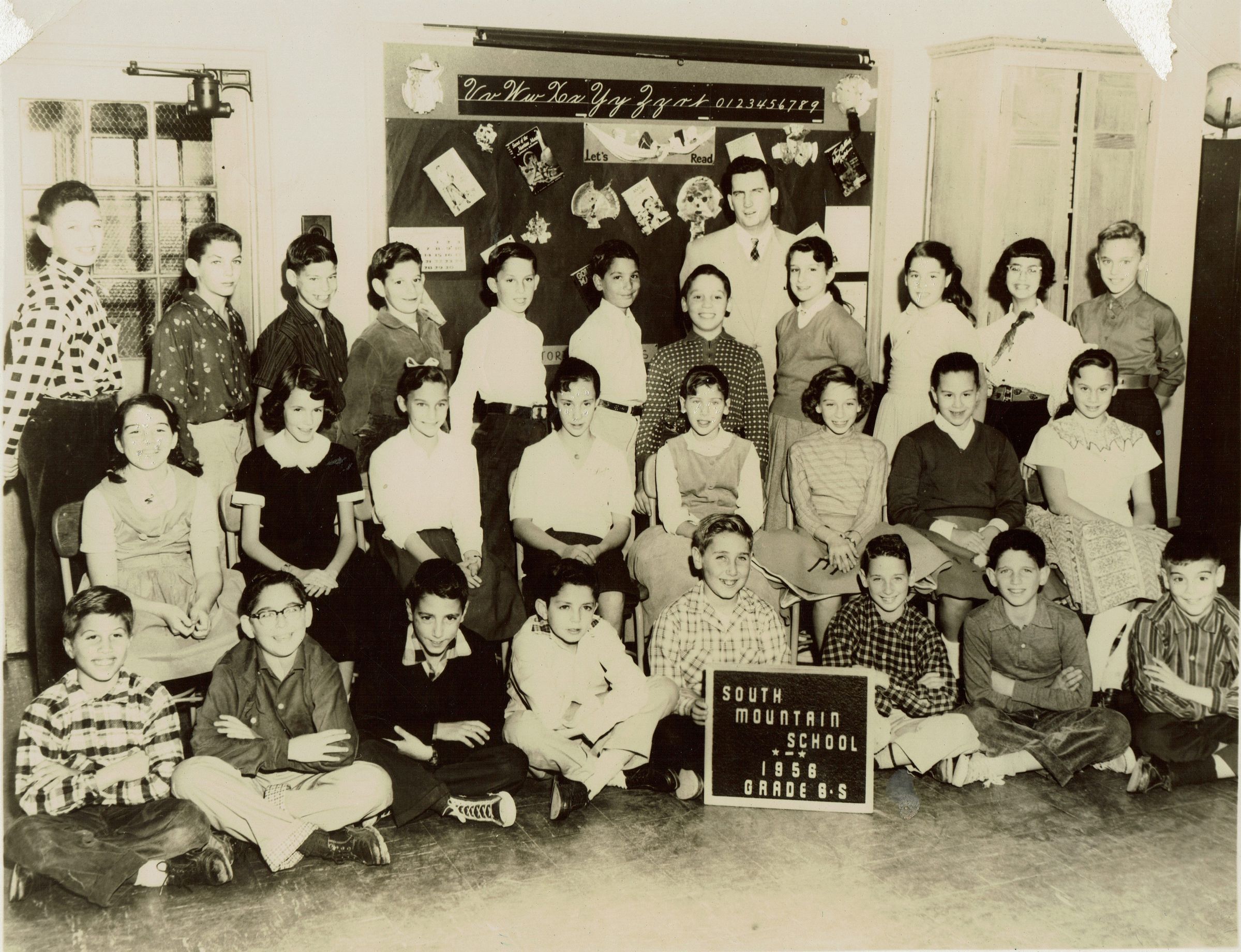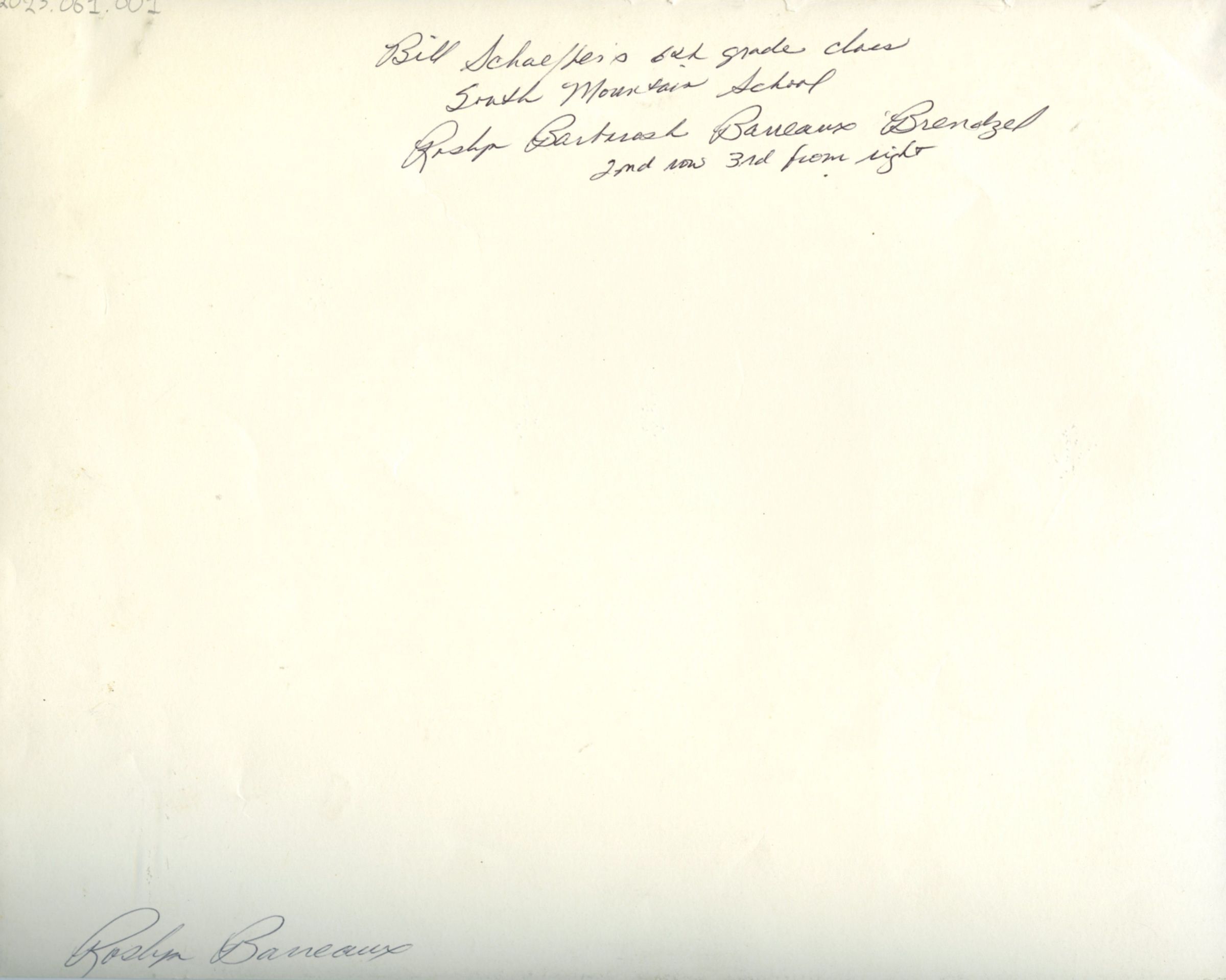 Photograph of teacher Bill Schaeffer's 6th grade class at South Mountain School from 1956. Back of the photograph has a message saying, "Bill Schaeffer'. 6th grade class South Mountain School Roslyn Barbarosh Barraeux Brendzel 2nd now, 3rd from right" and a signature by Roslyn BaneauxAcquisition