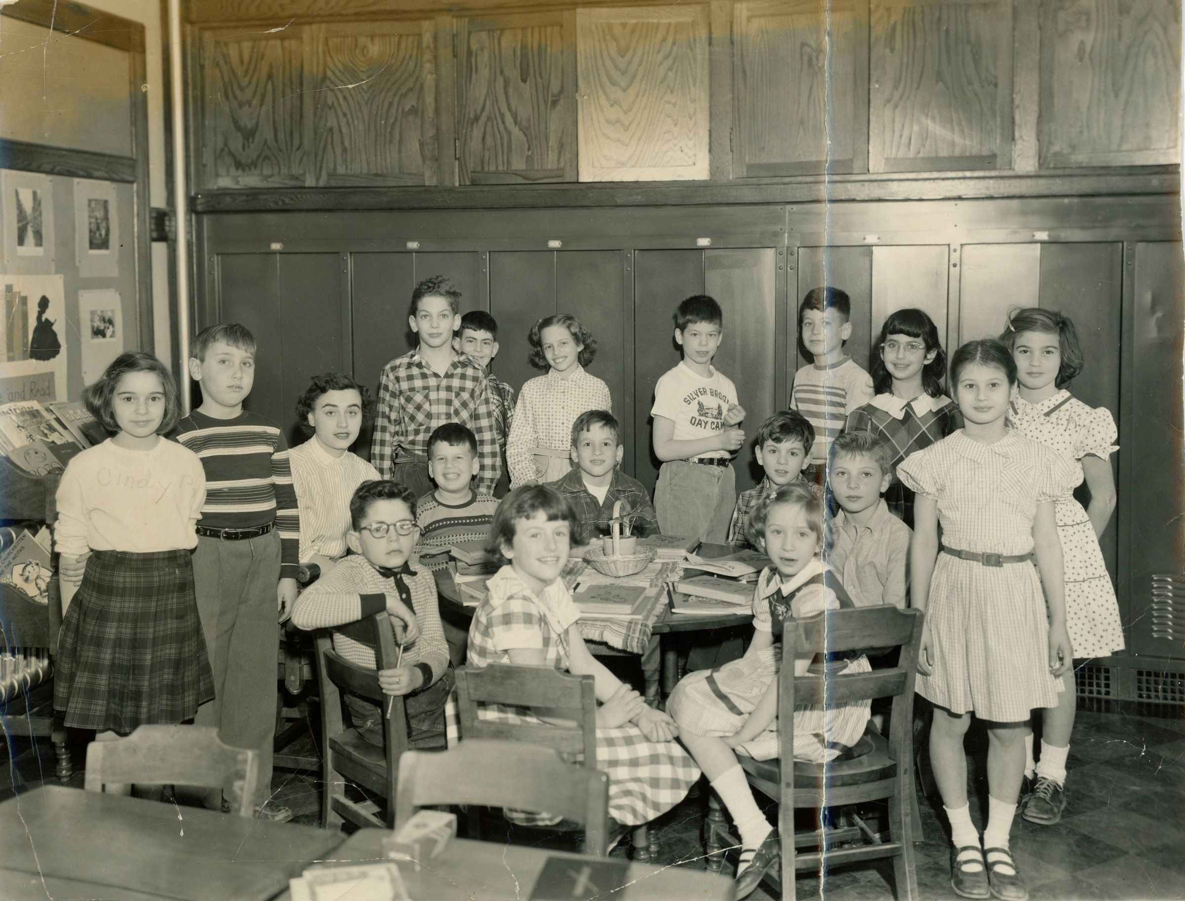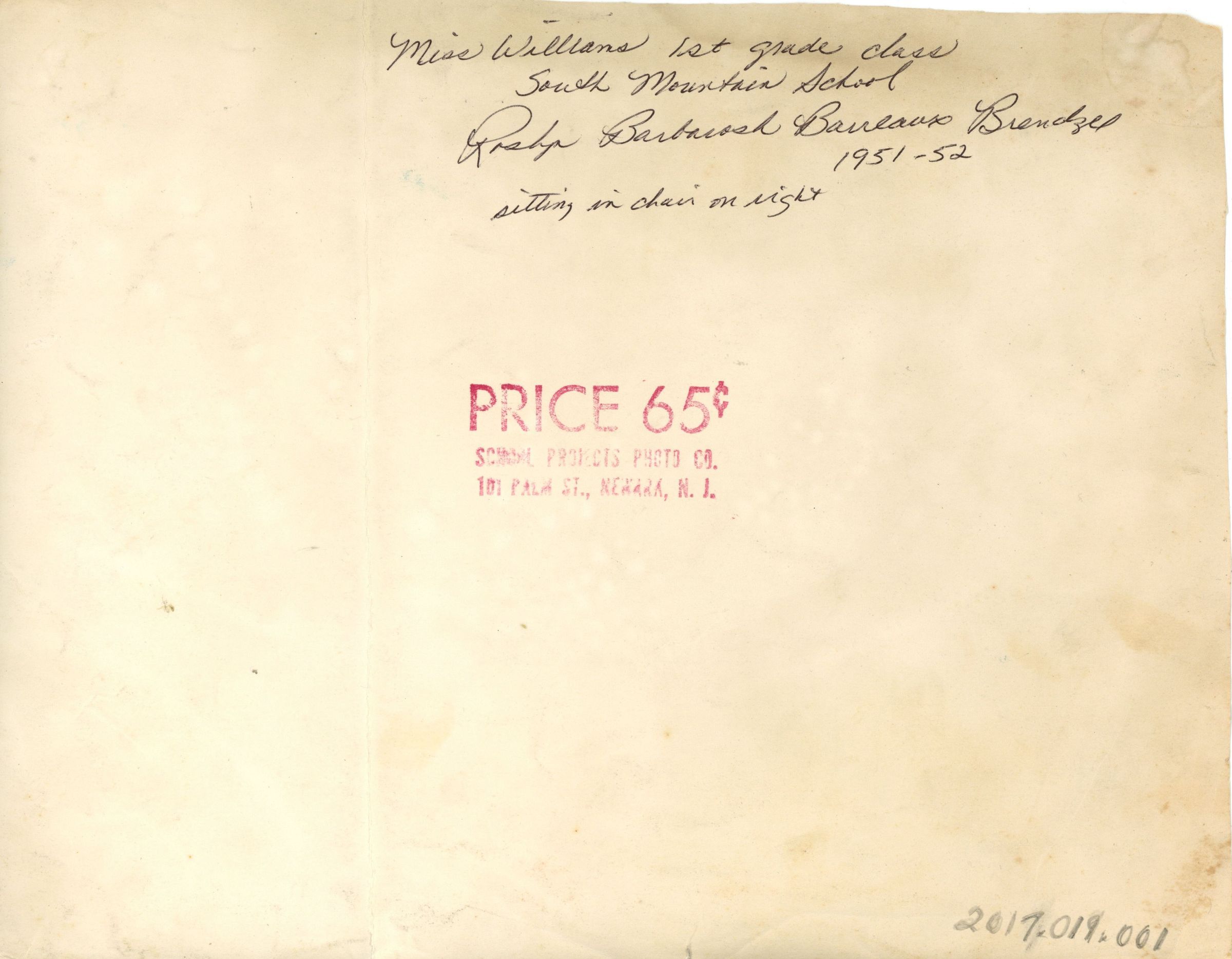 Photograph of Miss Williams' first grade class at South Mountain School, 1951-1952. Roslyn Barbararosh Barreaux Brenzel seated in the chair on the right.Acquisition