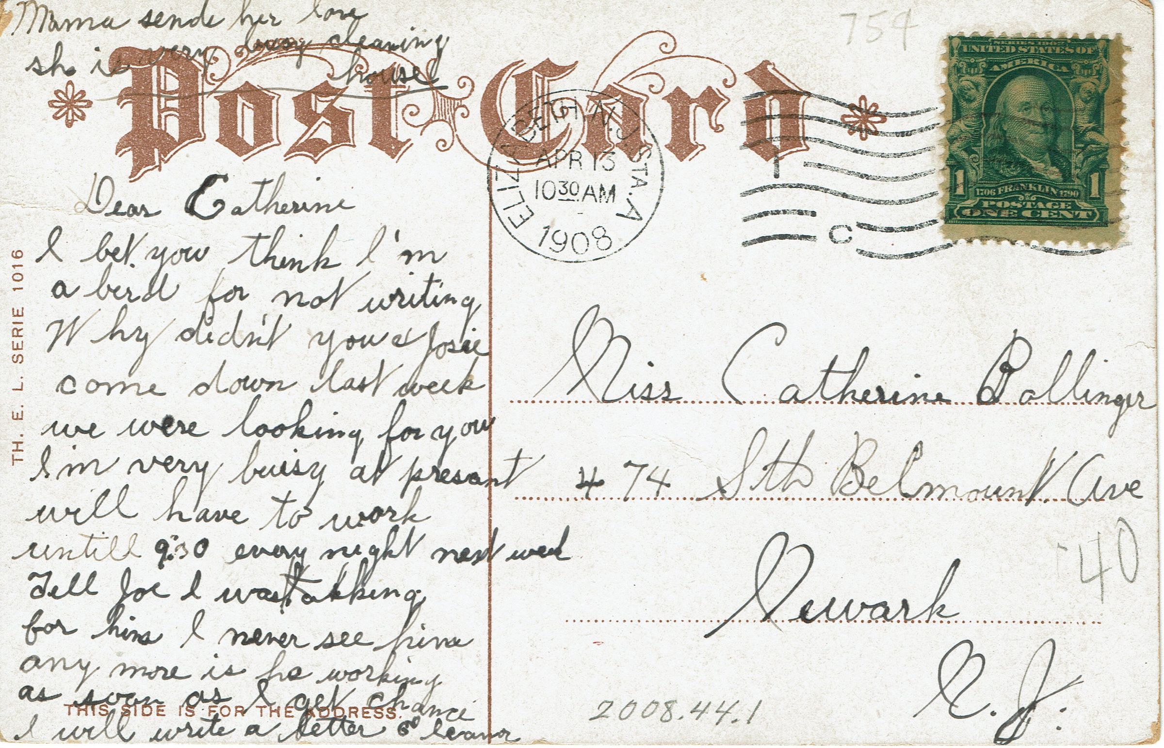 Postally used postcard that reads "Souvenir from Millburn, NJ". Postmarked Elizabeth, NJ, April 13, 1908. Addressed to "Miss Catherine Ballinger 474 8th Belmont Ave Newark, NJ".Collection