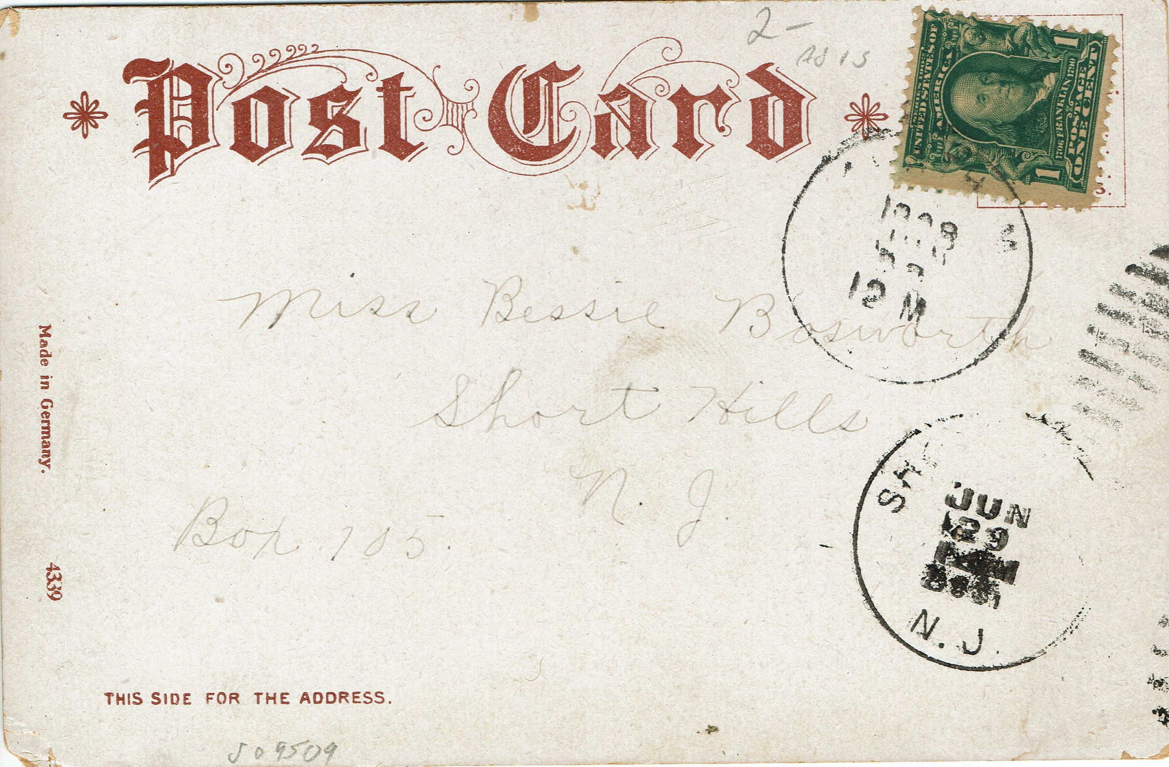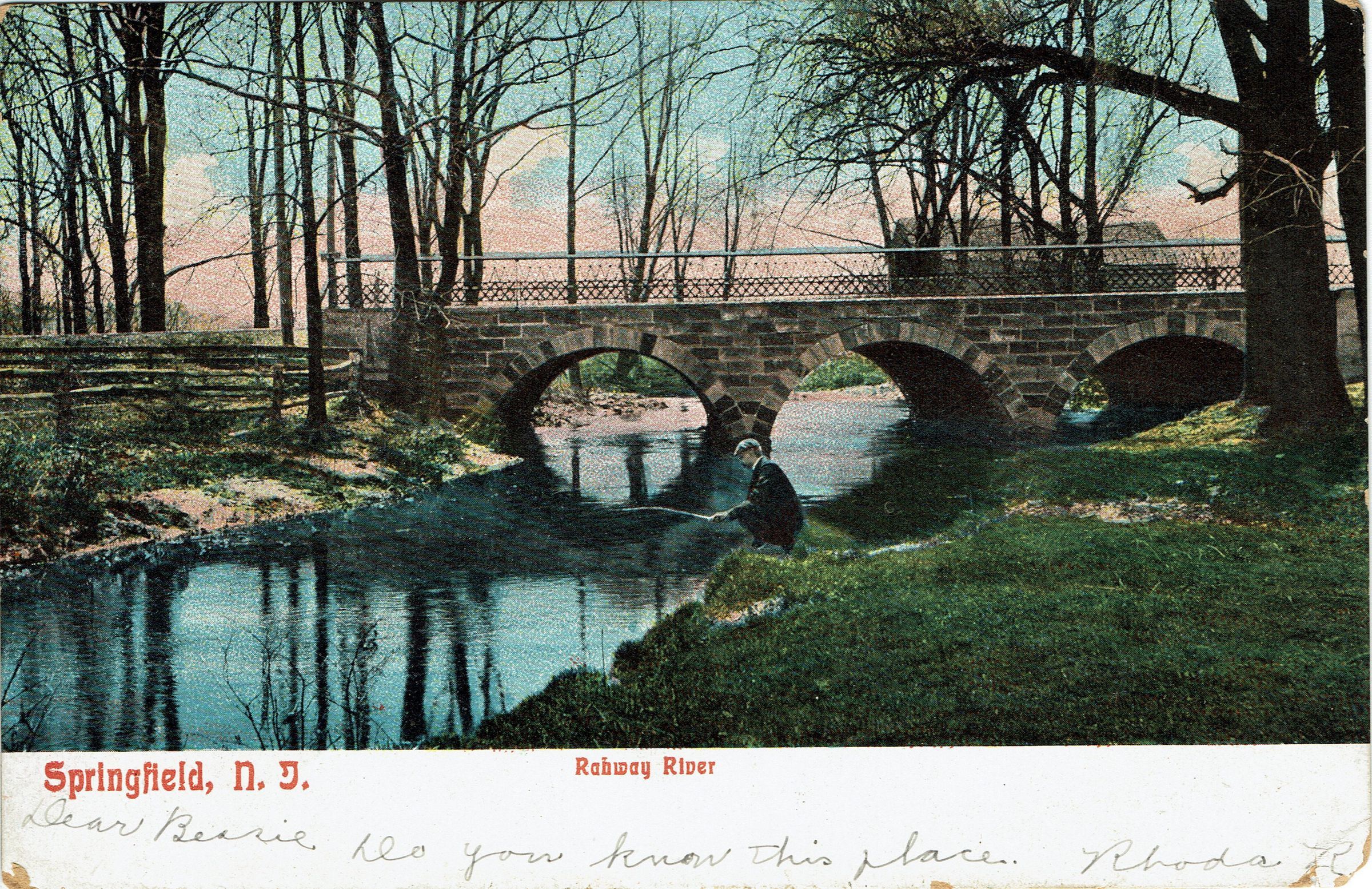 Postally used color postcard of the Rahway River in Springfield, N.J. mailed to Miss Bessie Bosworth, Short Hills, N.J. Box 105, postmarked received June 29, 1908.Collection