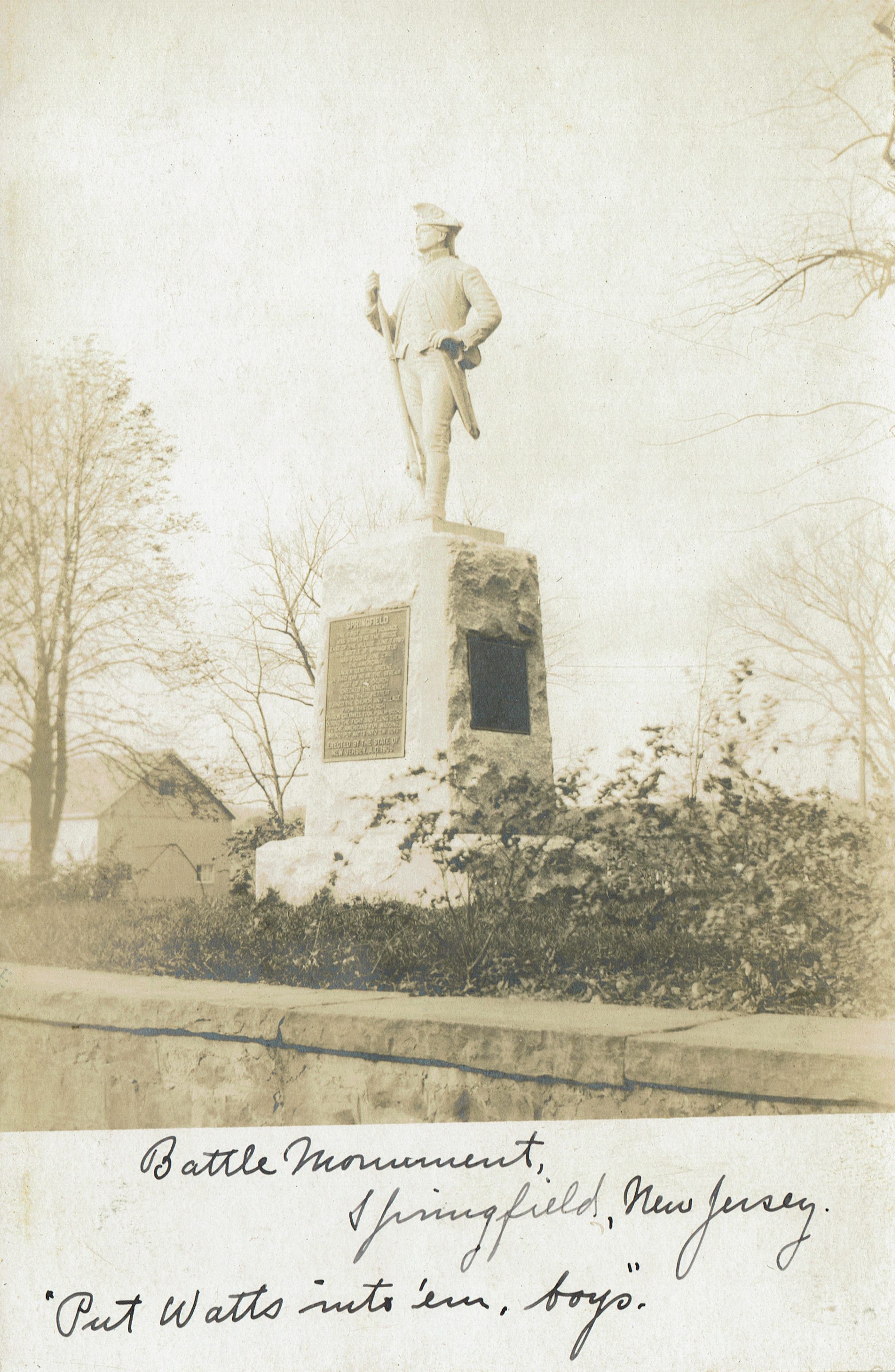 Postally unused B&W photographic postcard of the Solider's Monument, Springfield, NJ. Contains handwritten description on front: "Battle Monument., Springfield, New Jersey. 'Put Watts into 'em, boys."Collection