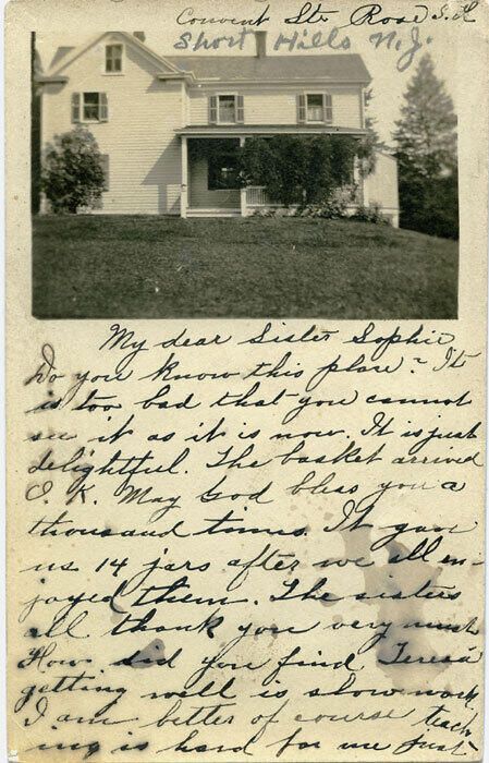 Postally unused real-photo postcard of St. Rose of Lima convent. Inked message on both sides of card says: "My dear Sister Sophie, Do you know this place? It is too bad that you cannot see it as it is now. It is just delightful. The basket arrived O.K. May God bless you a thousand times. It gave us 14 jars after we all enjoyed them. The sisters all thank you very much. How did you find Teresa? Getting well is slow work. I am better; of course teaching is hard for me just yet. So many grades in one room is not easy work. Did you see Sr. Consilia? She had quite a long stay at Rochester. I heard from Tillie. Will you please send me her address? She hadn't it in her letter.