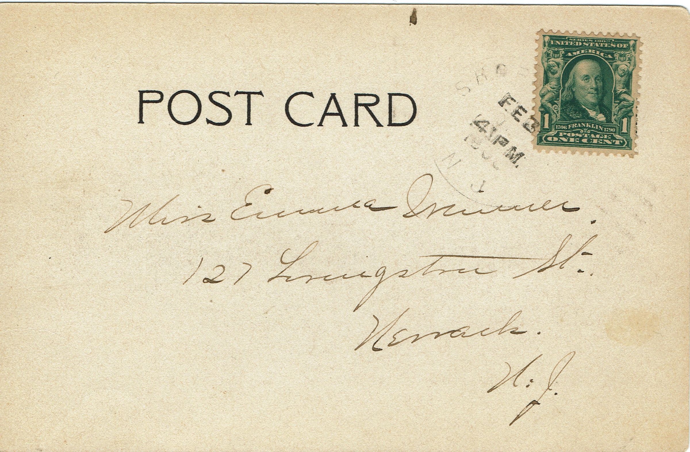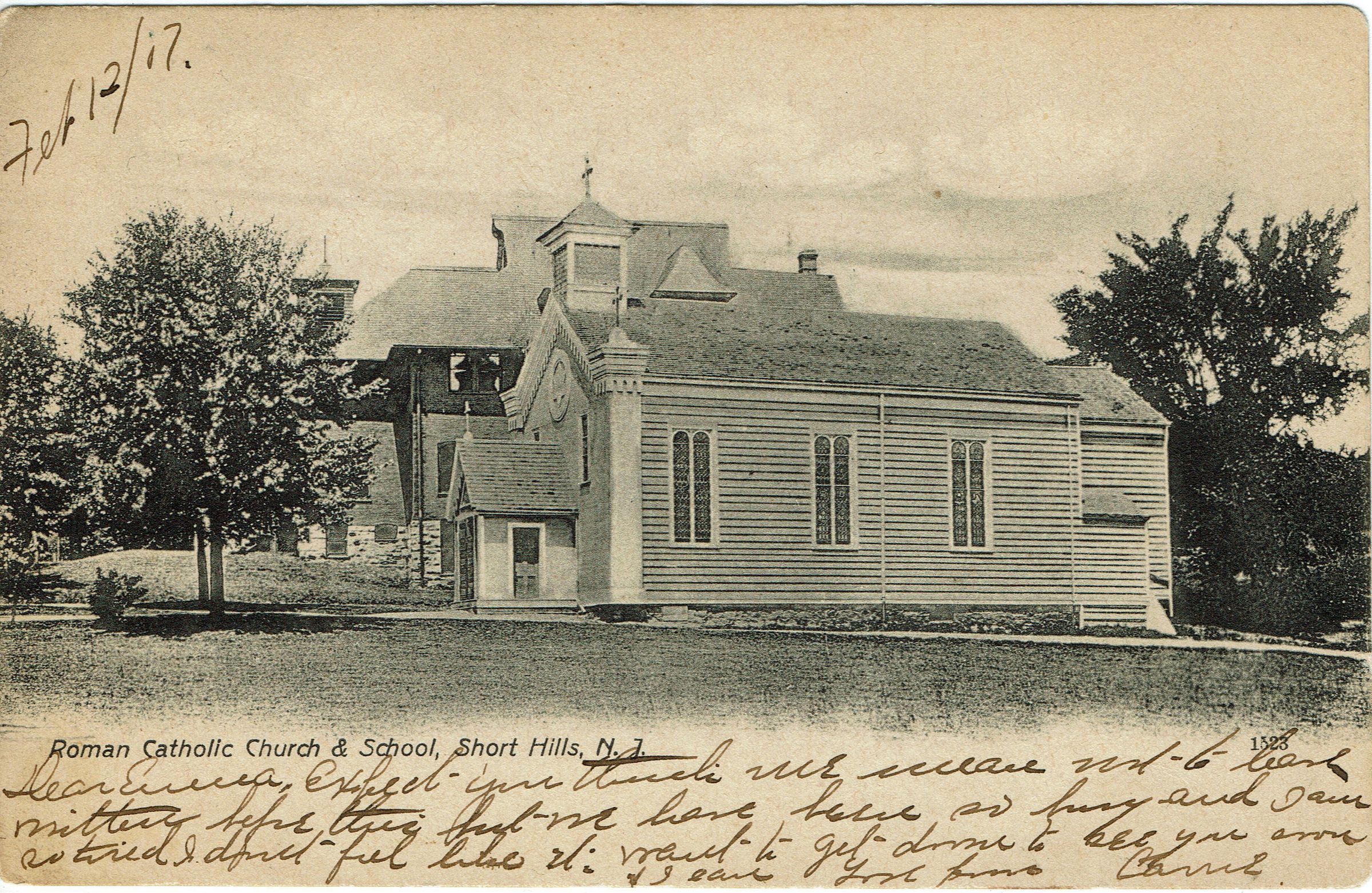 Postally used B&W photographic postcard of St. Rose of Lima dated February 12, 1907, postmarked Short Hills, February (?), 4:00 pm. Card is addressed to Miss Emma Wimmer, 127 Livingston Street, Newark, NJ.The church was moved from Morris Avenue, Springfield to this site on Short Hills Avenue. Note: The School was up the hill and not on Short Hills Avenue as it is at present. Message reads: "Dear Emma (Emma Wimmer), Expect you think me mean not to leave (?) before this, but we have (TK) so long and I am so tired I don't feel like it. I want to get done to see you and (?) lost time."Collection