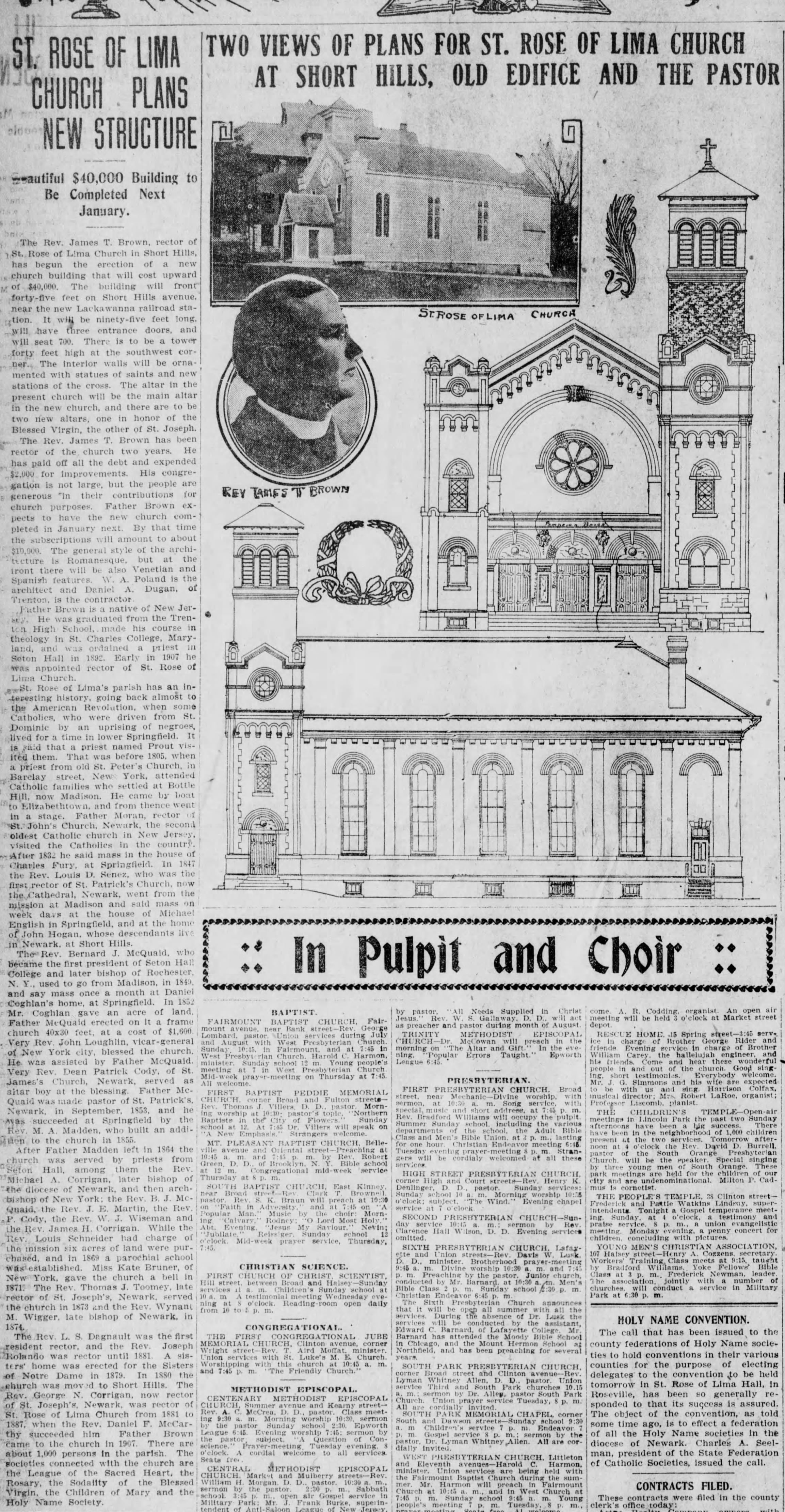 Reverend James T. Brown, Rector; Daniel A. Dugan, Builder. B&W photographic postcard of St. Rose of Lima Catholic Church on Short Hills Avenue. The image shows the 1909 brick church, which replaced the wooden building transported to Short Hills from Springfield in 1880.Collection