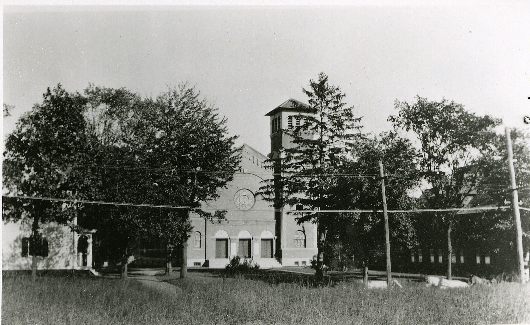B&W photograph of St. Rose of Lima Catholic Church on Short Hills Avenue. The image shows the 1909 brick church, which replaced the wooden building transported to Short Hills from Springfield in 1880.Collection