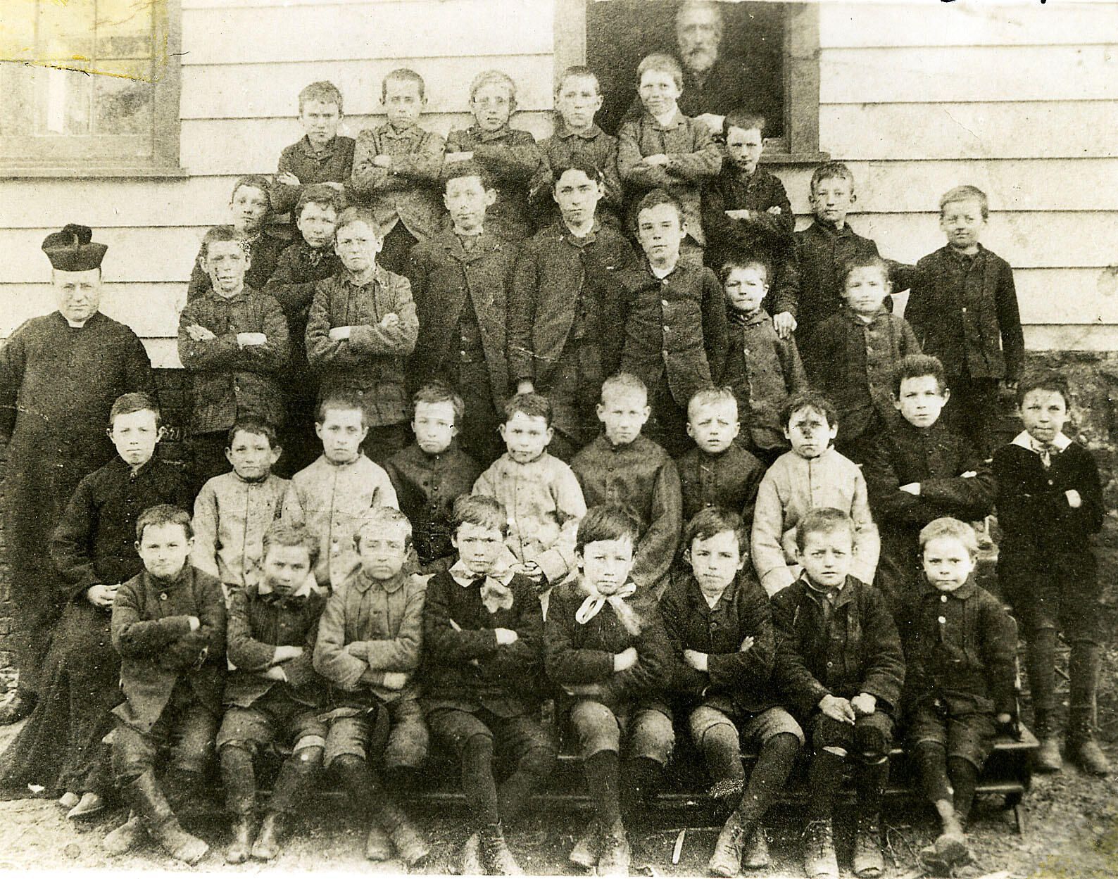 Man in the window is Mr. Sprague. Tow row, middle boy is Thomas Fennessey, Rev. D. F. McCarthy. Bottom row, 3rd over is Joseph Scholler & 4th over is John J. Lonergan.Dimensions